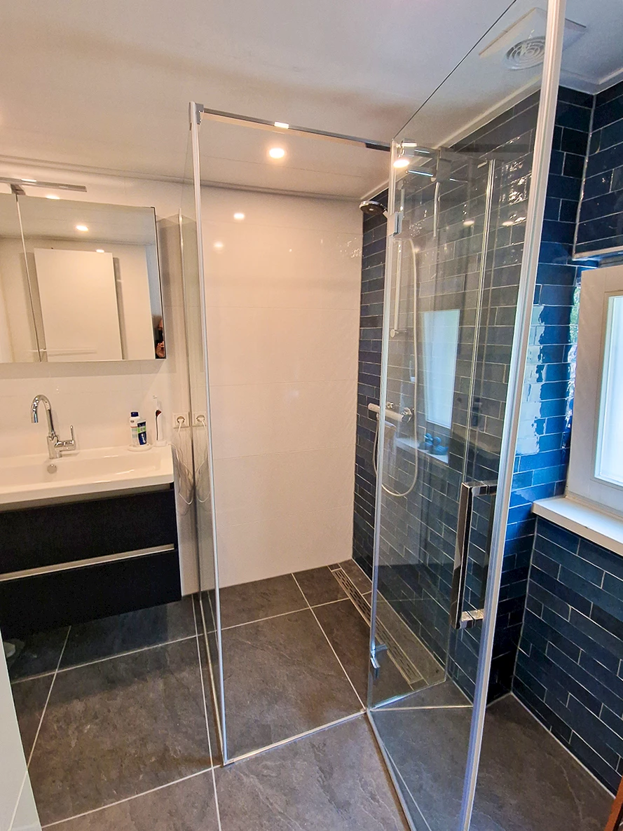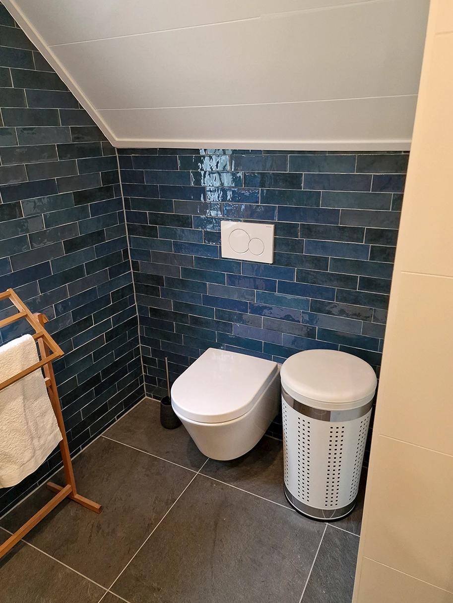 Door kleur toe te voegen aan de badkamer, zorg je ervoor dat de ruimte een persoonlijke touch krijgt. Een kleurrijke badkamer kan zoveel kleur bevatten als dat je zelf wil. Zo kun je ervoor kiezen om de gehele badkamer te bekleden met gekleurde tegels. Wil je liever op een subtiele manier kleur toevoegen? Kies dan bijvoorbeeld voor een gekleurd badmeubel, of bekleed een deel van de wanden met een kleurrijke tegel. Zo heeft deze familie gekozen voor een rustige tegelbasis en heeft daar blauwe decortegels én een blauw badmeubel aan toegevoegd. Zo ontstaat er een kleurrijke badkamer, zonder dat de badkamer erg druk oogt.