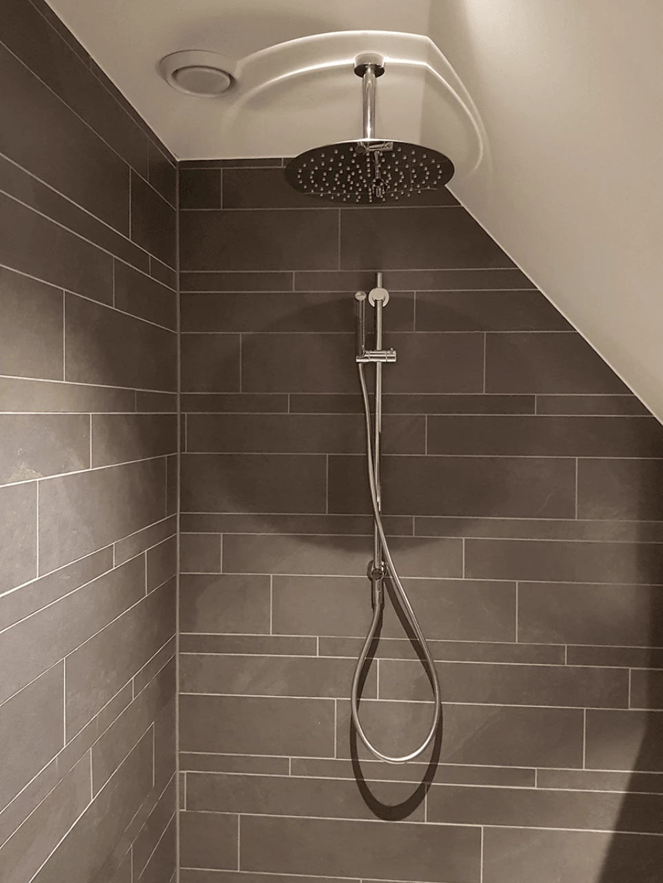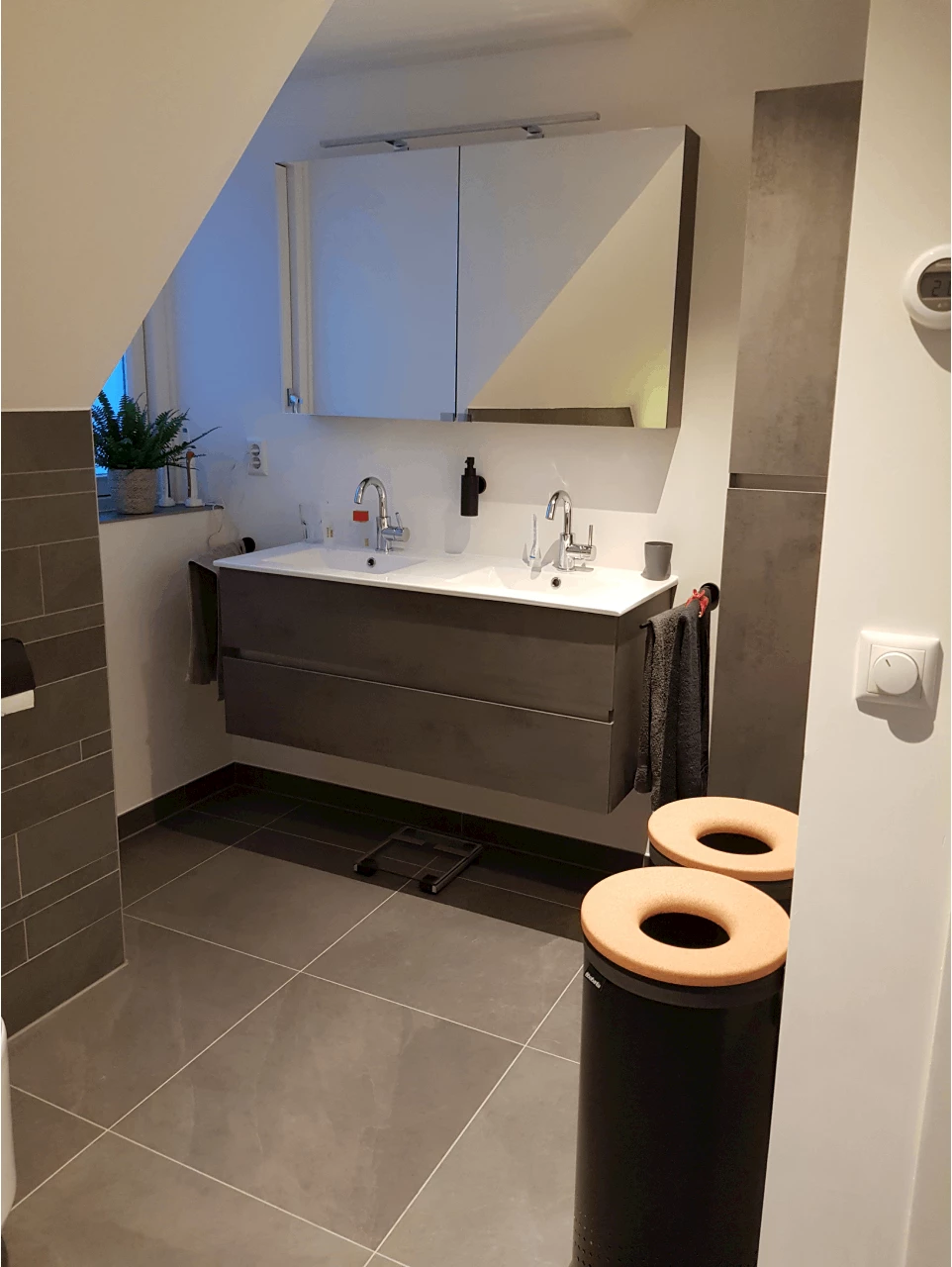 Deze familie heeft gekozen voor een combinatie van natuursteenlooktegels met een verschillende afmeting. Dit geeft de badkamer naast een strakke uitstraling ook een speelse look. Het badmeubel in de kleur Beton Antraciet past hier perfect bij. Op het badmeubel is een brede keramische wastafel geplaatst met een chromen wastafelkraan van Blaauw Sanitair. Boven deze combinatie is er gekozen voor een spiegelkast in de kleur Beton Antraciet. Niet alleen handig om jezelf in te bekijken, maar een spiegelkast zorgt ook voor meer opbergruimte in de badkamer. Ook de hoge kast komt in de kleur Beton Antraciet, hierdoor wordt de badkamer één geheel. Gekozen is voor een inloopdouche die wordt afgesloten door een glazen douchedeur. De douchecombinatie bestaat uit een ingebouwde regendouche en handdouche. Voor het optimale comfort heeft deze familie ook gekozen voor een ligbad met een waterval kraan. Deze familie heeft ook voor een toilet in de badkamer gekozen, dit is geen ‘normaal’ toilet maar een douche wc.