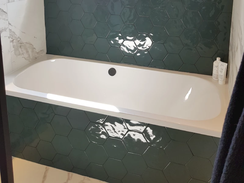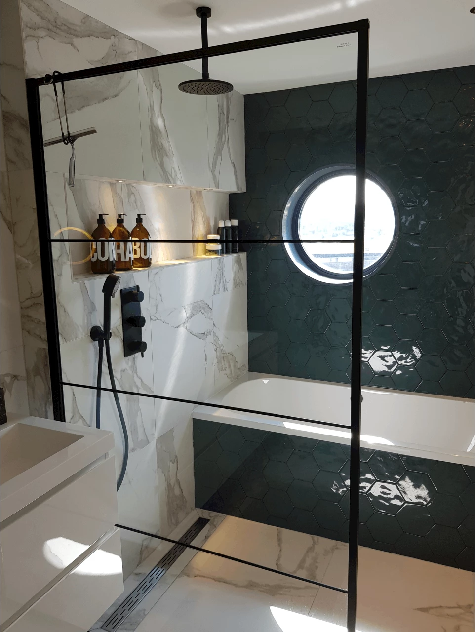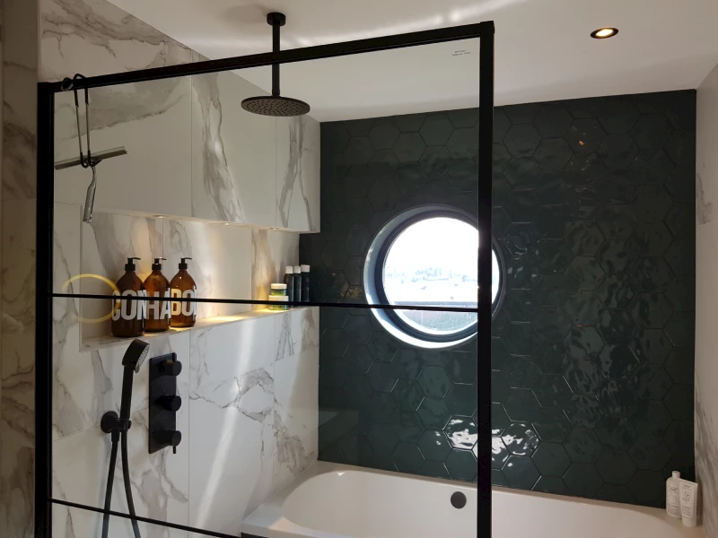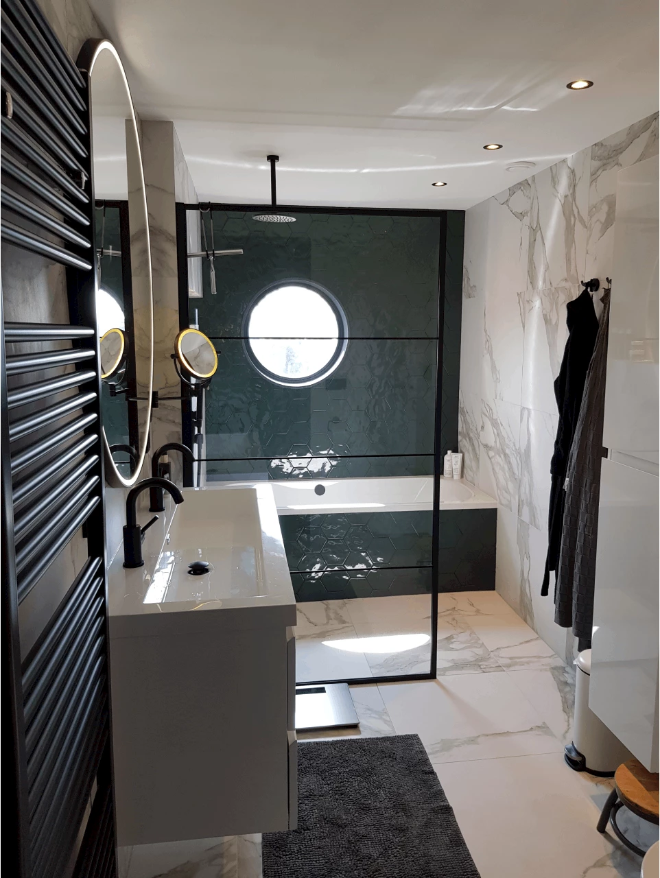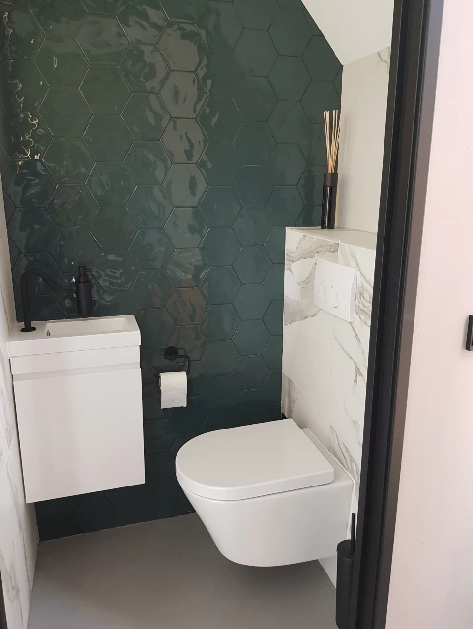 De tegelcombinatie bestaat uit matte marmerlook vloer- en wandtegels en groene glans hexagon tegels. De samenvoeging van de twee verschillende tegels geeft de badkamer een speelse en luxe sfeer. Het badmeubel heeft een witte hoogglans kleur en is voorzien van twee greeploze softclose lades. Daarop is een mineraalmarmer wastafel geplaatst met twee mat zwarte wastafelkranen. De combinatie tussen mat zwart en wit zorgt voor een strakke uitstraling. Boven de badmeubelset hangt een ronde spiegel met een zwart kader, de spiegel is voorzien van ledverlichting. Dit zorgt niet alleen voor extra verlichting, maar het creëert ook extra sfeer. Het mat zwart komt ook terug in de regendouchecombinatie, deze bestaat uit een plafond regendouche en een handdouche. Om ervoor te zorgen dat het water niet de ruimte inloopt is er een glazen wand met een zwart frame geplaatst. Het glas is voorzien van een nano antikalk coating, waardoor je nauwelijks last hebt van kalkaanslag. Om optimaal te kunnen ontspannen is er ook een bad geplaatst. De toiletset bestaat uit een design keramisch wandcloset en een design softclose zitting. De ruimte wordt verwarmd door de mat zwarte designradiator.