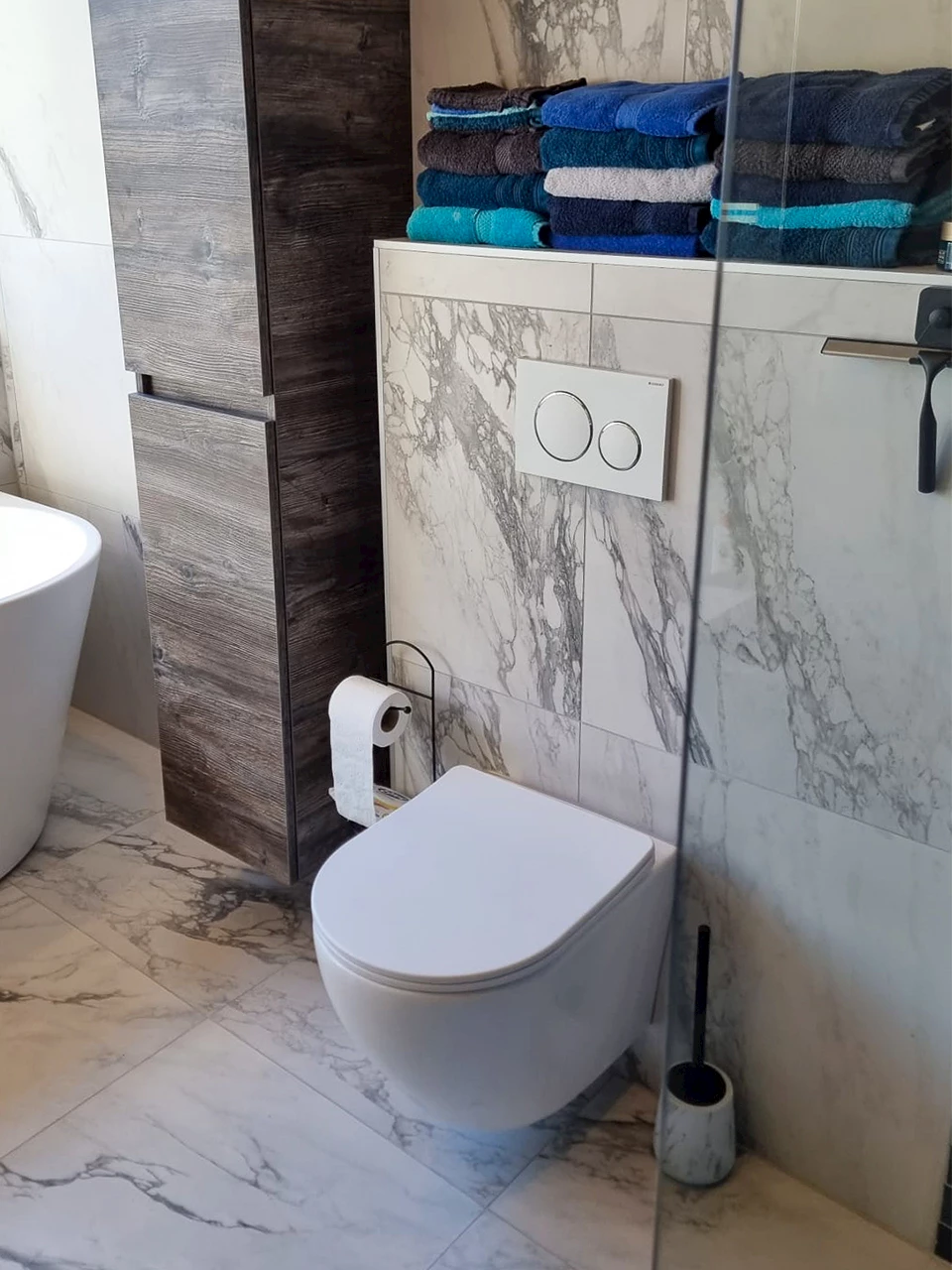 Deze unieke badkamer is opgeleverd bij een familie uit Wageningen door Sani4All. De combinatie van de marmerlook tegels, de gekleurde decortegels en de Sunshower maken van deze marmerlook badkamer een luxe geheel.