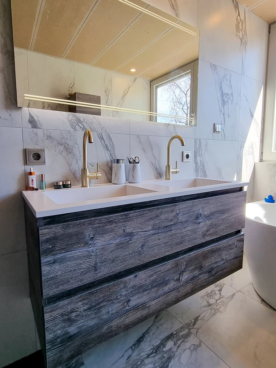 Een ander element dat ervoor zorgt dat de badkamer een luxe uitstraling heeft, is de badmeubelset. Er is een combinatie gemaakt van een onderkast in de kleur Jackson Pine, een mat witte wastafel en een prachtige design spiegel. Aan deze combinatie zijn twee geborsteld messing kranen toegevoegd die het geheel helemaal afmaken. Om ervoor te zorgen dat de familie al hun spullen kan opbergen, is er ook een kolomkast aan het geheel toegevoegd. Niet alleen de wastafelkranen zijn van geborsteld messing, de kleur komt ook terug in de bad- en douchekranen. Hierdoor heeft de gehele badkamer dezelfde sfeer en uitstraling, waardoor de ruimte echt een geheel is.