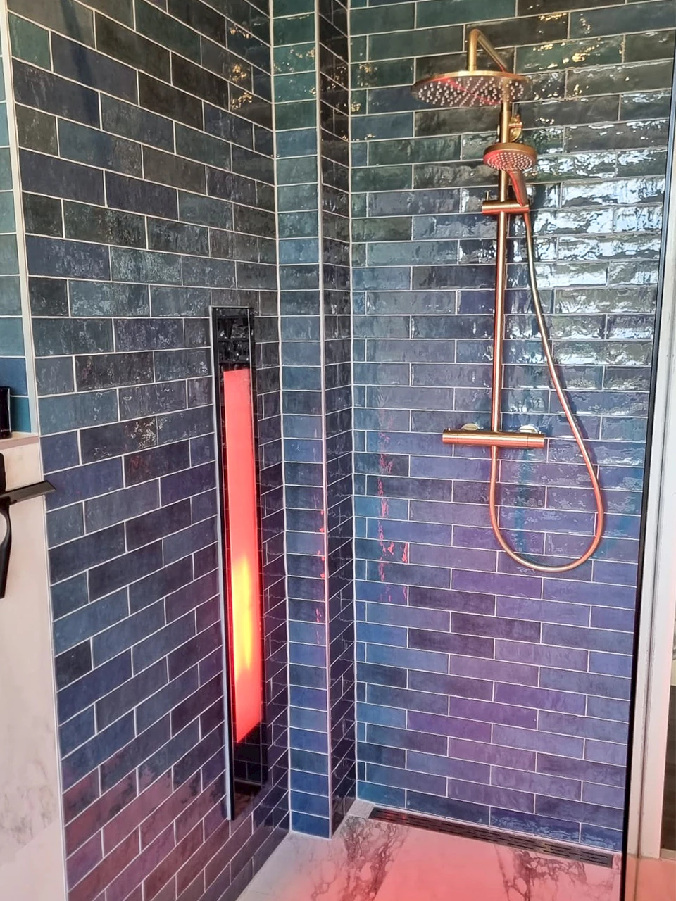 Na een lange dag is het natuurlijk heerlijk als je tot rust kan komen in je badkamer. In deze badkamer weet je zeker dat dit lukt. Er is namelijk een semi-vrijstaand bad in de badkamer geplaatst, waar je languit in kunt liggen. Ook heeft de familie gekozen voor een Sunshower, dit is een lamp voorzien van infrarood en Uv-licht. Zeker in de winter kan dit een fijne toevoeging aan je badkamer zijn.