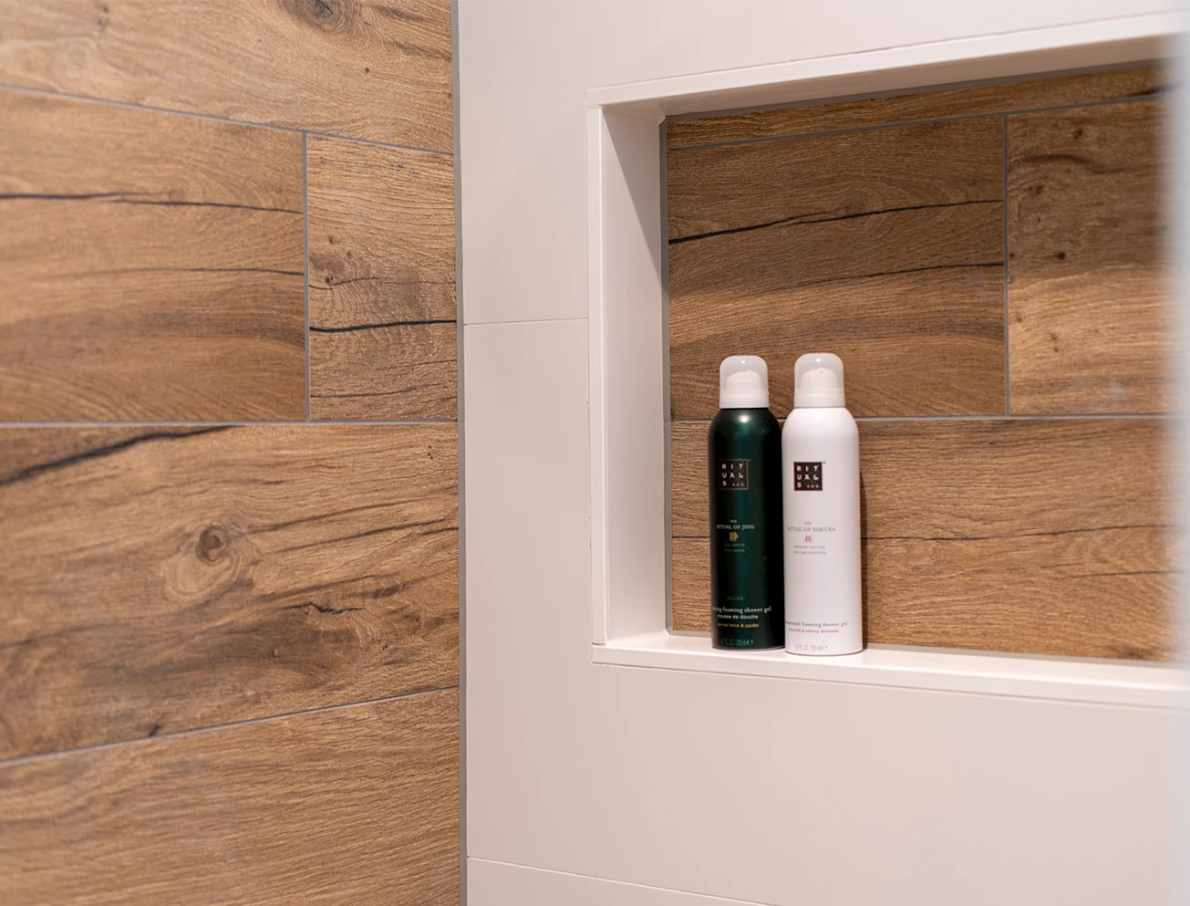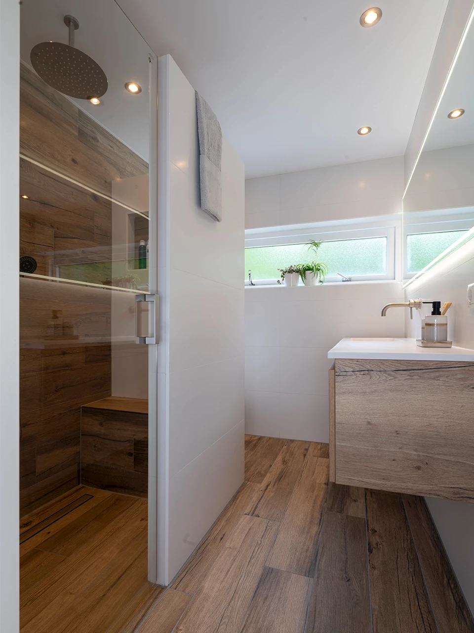 Scandinavische badkamers staan bekend om de oase van rust die ze met zich meebrengen en dat kun je goed terugzien in de badkamer van familie de Boer. De basis van de badkamer bestaat uit houtlook 20x120 cm vloertegels en mat witte 40x120 cm wandtegels. Door voor grote tegels te kiezen heb je minder voegen waardoor de badkamer rustiger oogt. De keuze voor minimalistische elementen komt terug in de doucheruimte. Hier is gekozen voor een minimalistische glazen douchedeur en een rvs-regendoucheset.