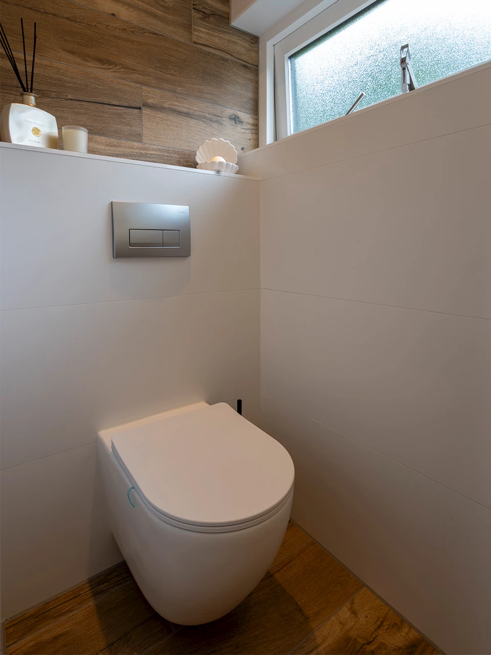 Een ander belangrijk kenmerk van zowel de minimalistische als Scandinavische stijl is het comfort. Om de ruimte van wat extra comfort te voorzien heeft de familie gekozen voor elektrische vloerverwarming. Wanneer zij uit de douche komen stappen ze dus op een heerlijk warme vloer. Bovendien kan de vloerverwarming de volledige ruimte verwarmen waardoor een radiator niet meer nodig is.