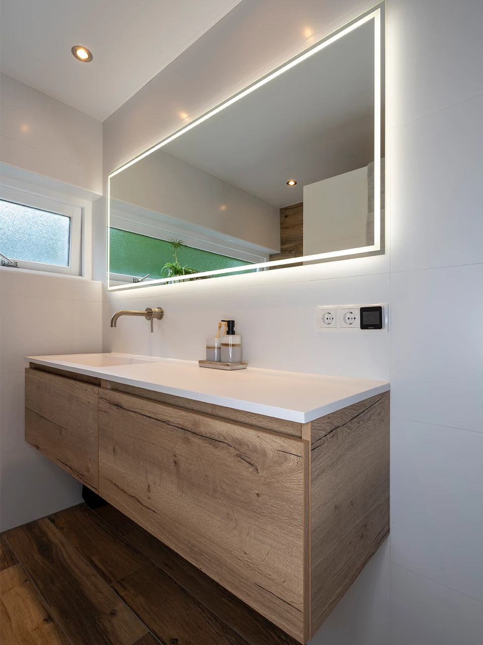 Om eenheid in de ruimte te creƫren is er voor de volledige badkamer gekozen voor rvs-accenten. Aan de badmeubelset, welke bestaat uit een houtlook onderkast, mat witte wastafel en een luxe spiegel, is bijvoorbeeld een rvs-inbouwkraan toegevoegd. En ook bij de toiletset is er gekozen voor een rvs-drukpaneel. Deze is gecombineerd met een mat wit toilet, welke goed combineert met de mat witte wastafel.