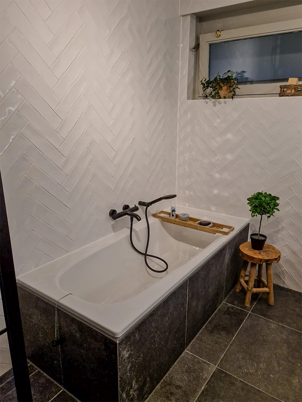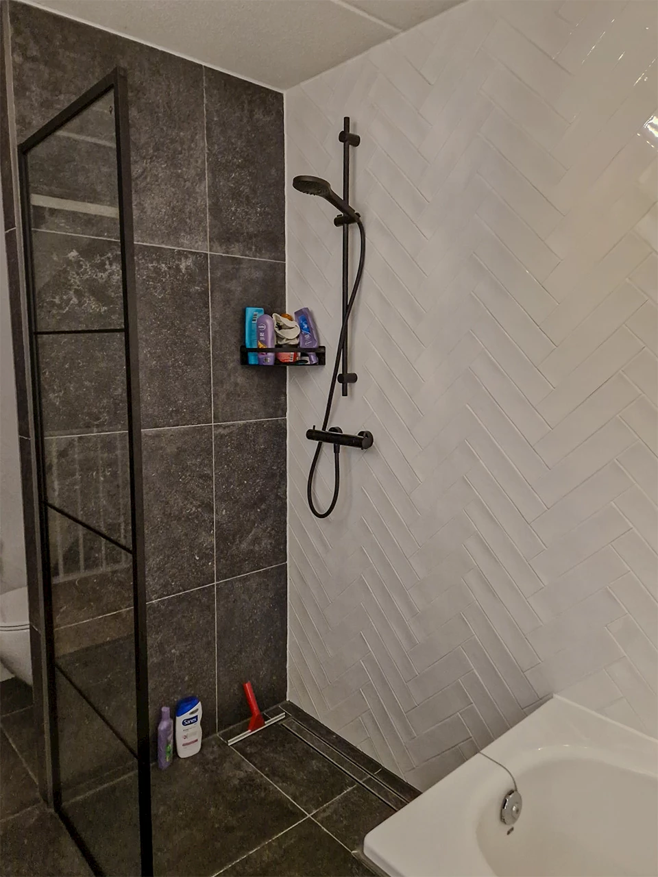 In deze badkamer is er gekozen voor een tegelcombinatie welke uit twee soorten tegels bestaat. Op de vloer zijn 60x60 cm tegels geplaatst in de kleur Antraciet mat. Deze zijn niet alleen op de vloer, maar ook op een wand in de doucheruimte geplaatst. Dit geeft de badkamer net wat extra diepte. De rest van de wanden zijn voorzien van witte visgraattegels, welke een mooie toevoeging zijn aan de badkamer.