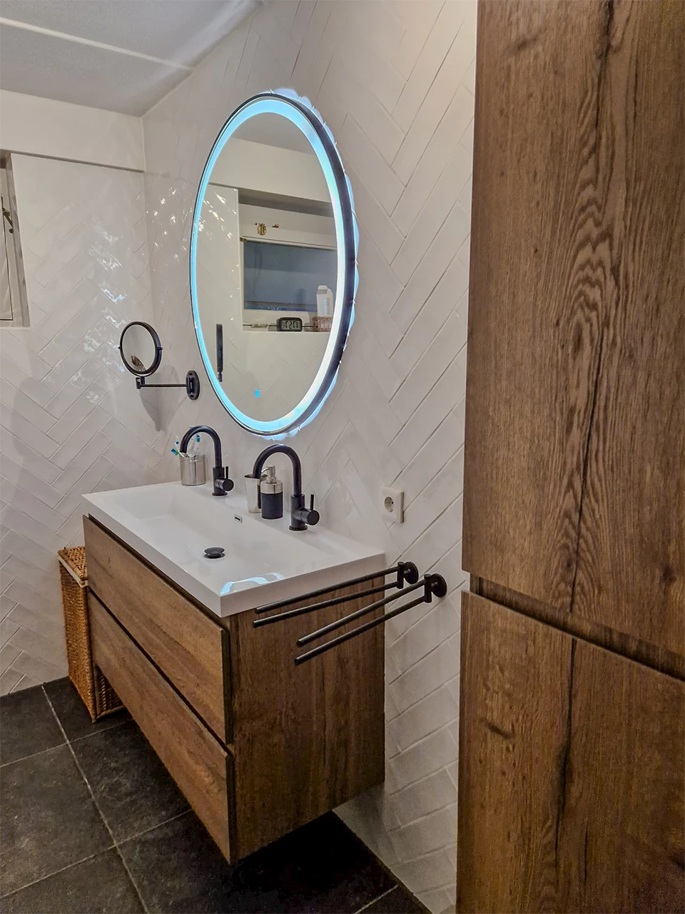 Wanneer je een nieuwe badkamer hebt, is het natuurlijk wel zo fijn wanneer er voldoende opbergruimte is. Want een opgeruimde badkamer zorgt er toch voor dat je net wat beter tot rust kunt komen. Daarom heeft deze familie gekozen voor twee hoge kolomkasten en een ruime badmeubelset. Deze set bestaat uit een onderkast in de kleur Tobacco Oak en een witte wastafel. Op de wastafel zijn twee mat zwarte wastafelkranen geplaatst. Om de set af te maken is er gekozen voor een spiegel met een mat zwart frame. De keuze voor de mat zwarte accenten versterken de prachtige moderne uitstraling van deze badkamer.