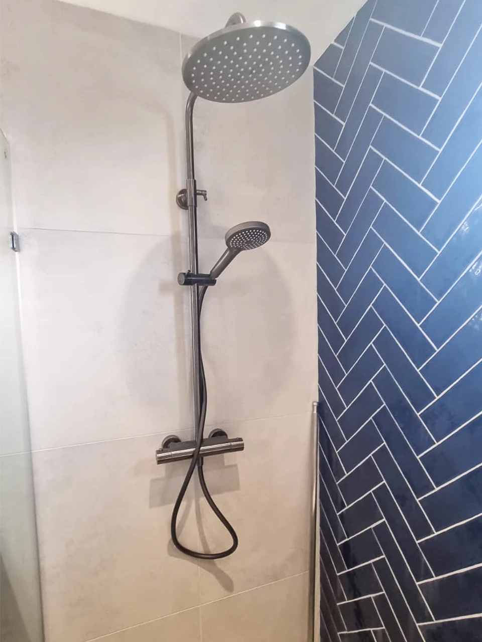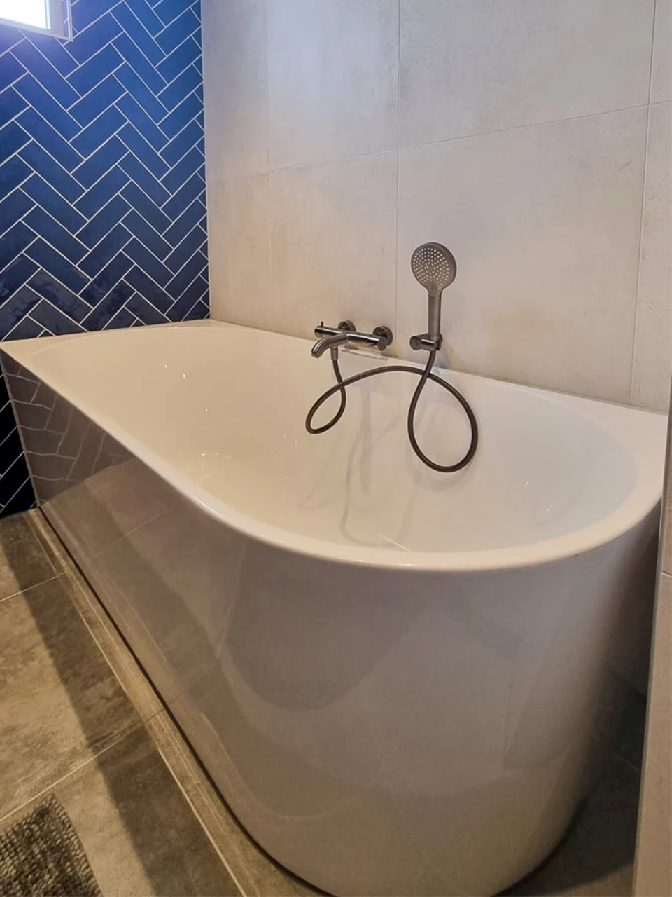 De basis van de badkamer bestaat uit betonlook vloertegels in de kleur Parker Anthracite en lichte betonlook wandtegels in de kleur Parker White. Door de vloer net een wat donkerdere kleur te geven oogt de ruimte wat groter. Deze basis wordt aangevuld door de visgraattegels in de kleur Blue Navy welke op in de doucheruimte en achter het bad zijn geplaatst. Deze geven de badkamer een moderne en speelse touch.