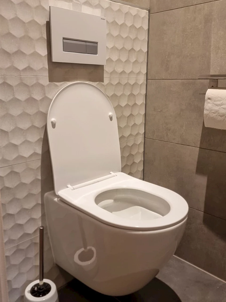 In de toiletruimte durven de meeste mensen toch net wat meer uit te pakken dan bij een badkamer. Je kunt bij een toiletruimte op een subtiele manier toch voor een unieke uitstraling kiezen. De basis van deze toiletruimte bestaat uit wandtegels in de kleur Grigio en betonlook vloertegels. Beide tegels hebben een grijze kleur, waardoor de ruimte een rustige uitstraling heeft. Op het inbouwreservoir zijn prachtige hexagon tegels in de kleur Grijs mat geplaatst. Deze zorgen voor de unieke touch van de ruimte.