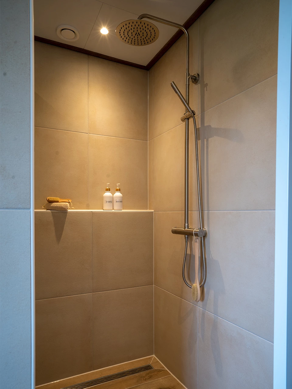 Deze badkamer heeft nog meer prachtige elementen. Zo zijn er wandplanken geplaatst tussen twee wandjes, waarmee een stijlvolle opbergplek is gecreƫerd. Of neem de doucheruimte welke is voorzien van een rvs-regendoucheset. In de ruimte is ook een plek gemaakt om de verzorgingsproducten op te zetten, ideaal.