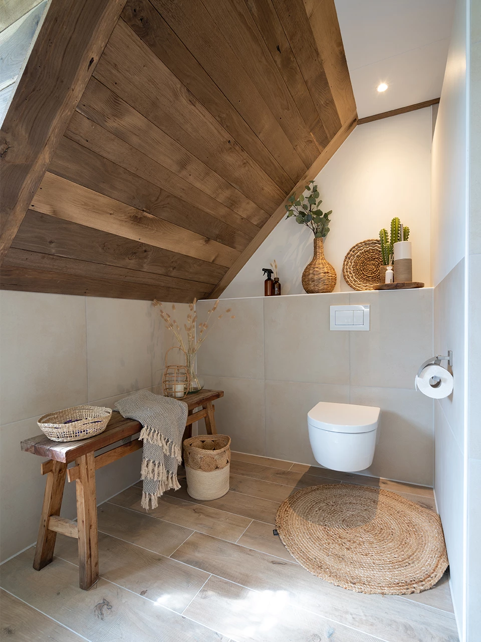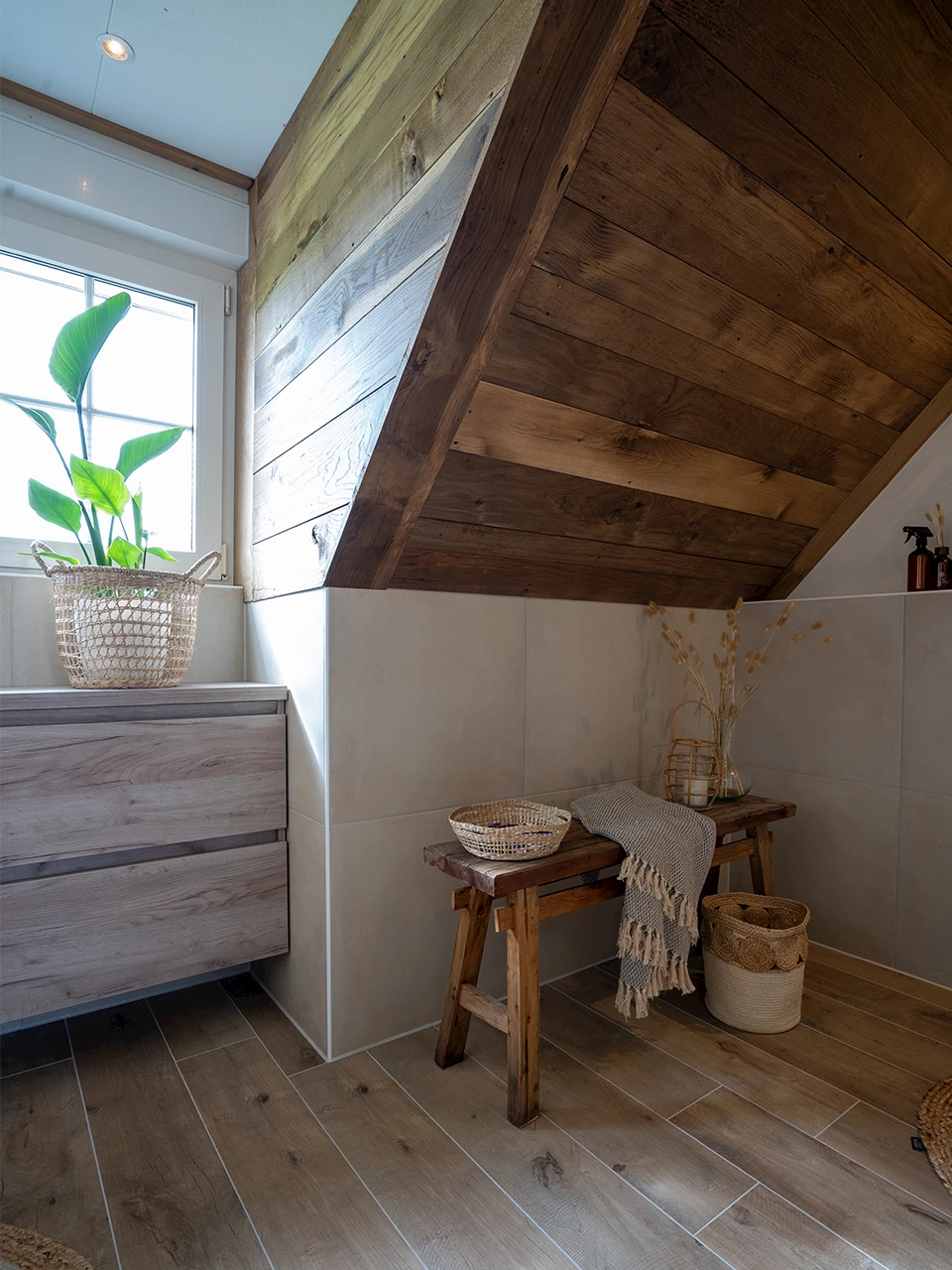 In deze badkamer is er gekozen voor wandtegels in de kleur Powder, welke een warme uitstraling hebben. Deze tegels zijn gecombineerd met houtlook vloertegels en passen prachtig bij de lichte wandtegels. Er is gekozen om een deel van de wanden tot de helft te bekleden. De rest van de badkamer is gestukt, wat voor een strak geheel zorgt. Omdat het plafond ook van hout is wordt de landelijke uitstraling van de ruimte versterkt.