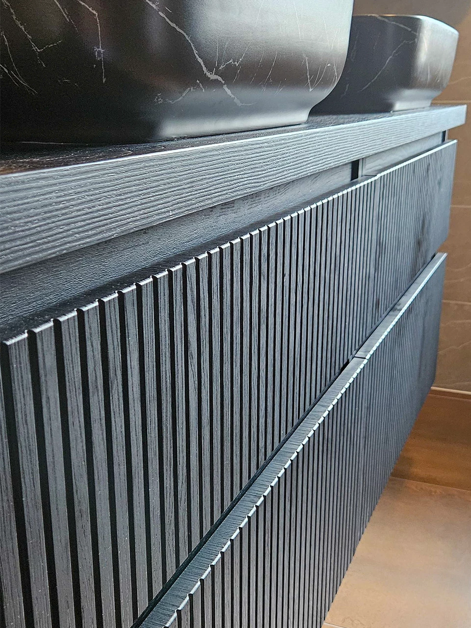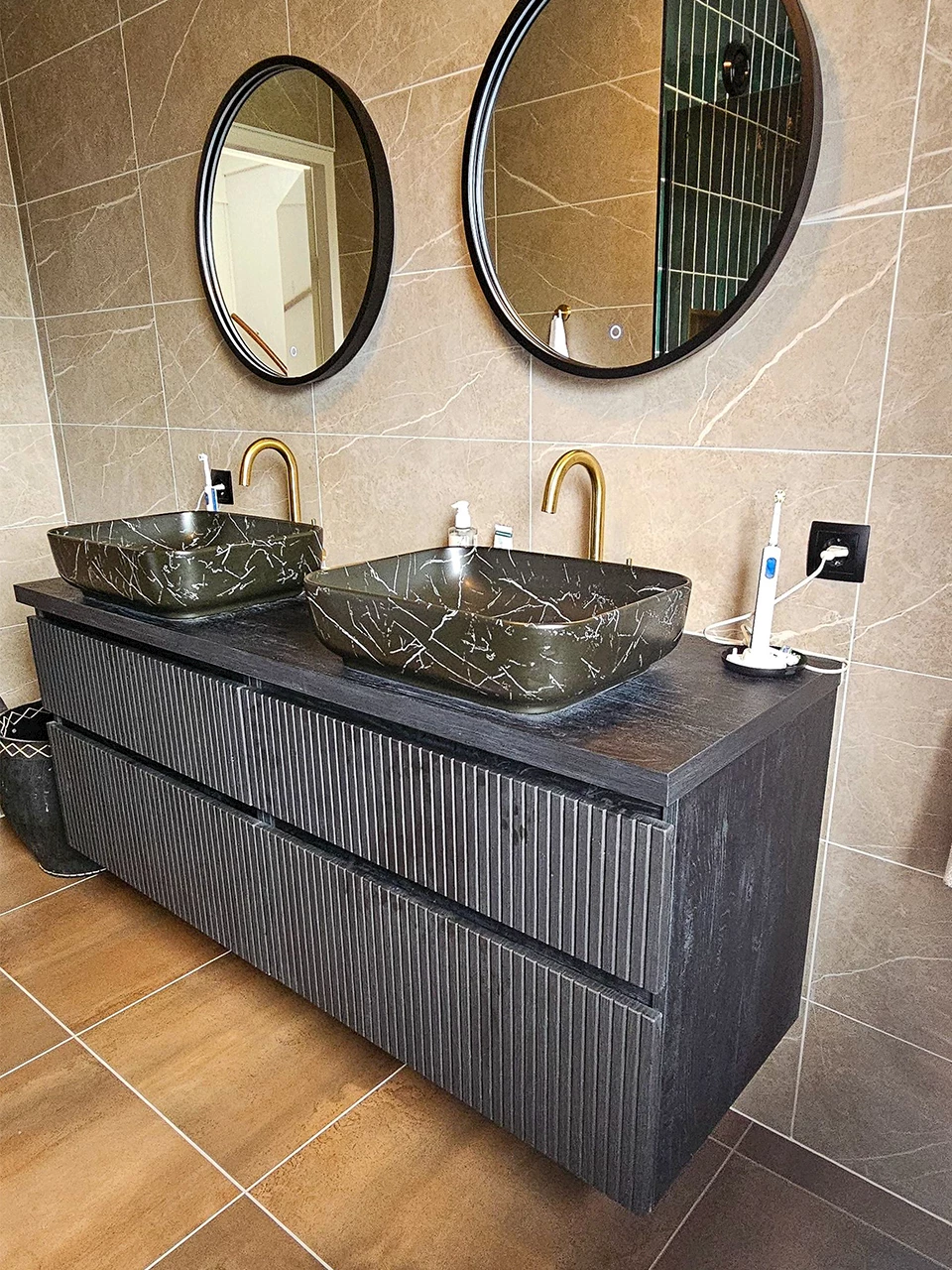 Niet alleen de tegelcombinatie is uniek, ook de badmeubelset is een echte eyecatcher. Deze set bestaat uit een zwarte houtlook onderkast met een ribbelfront. Boven op de onderkast zijn twee prachtige marmerlook waskommen en twee goudkleurige wastafelkranen geplaatst. Boven het meubel hangen twee ronde spiegels met een mat zwarte lijst, welke door de zwarte kleur goed passen bij het meubel. De keuze voor goudkleurige accenten komt ook terug in de doucheruimte. Daar is gekozen voor een goudkleurige douchekraan en een handige goudkleurige inbouwnis.