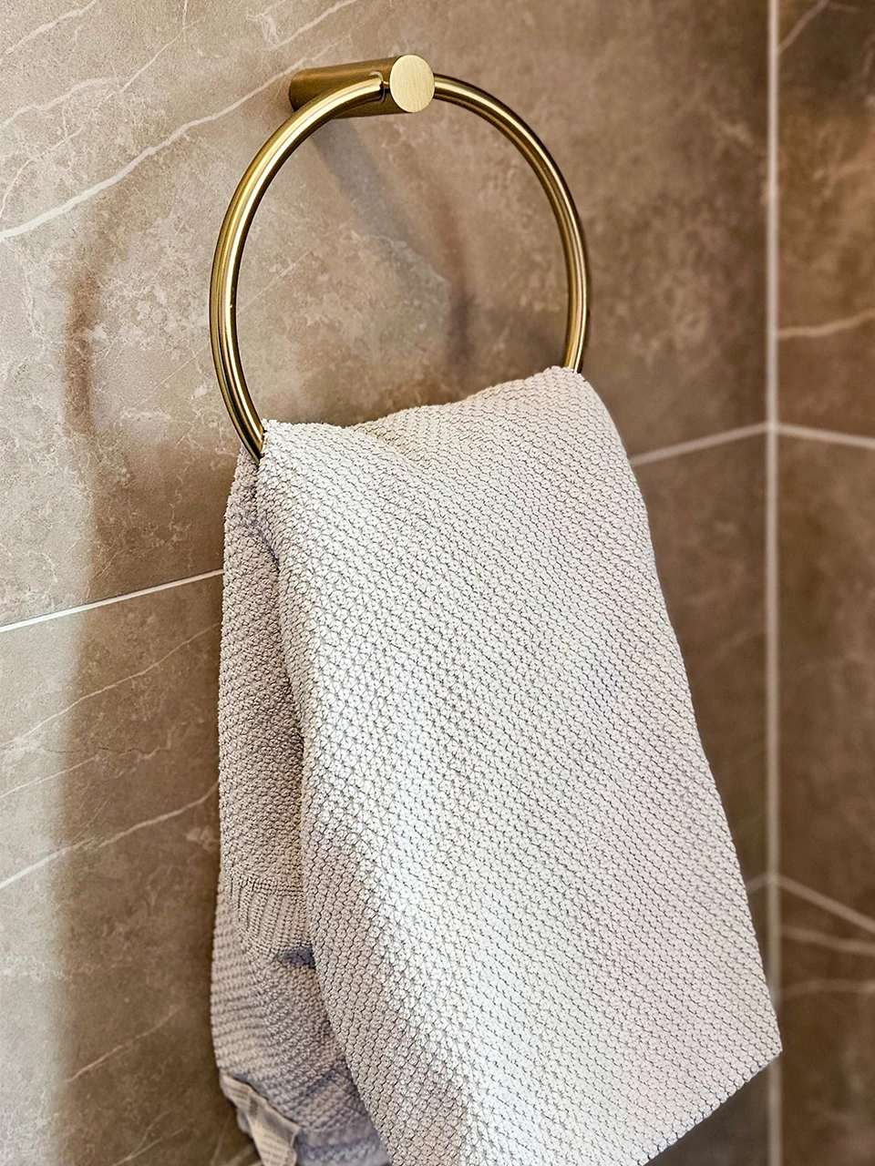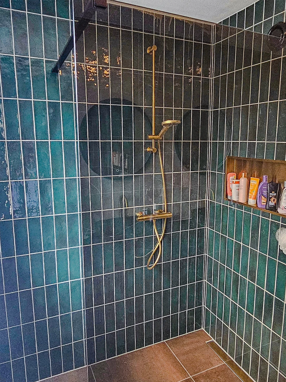 De basis van deze badkamer bestaat uit een combinatie van een tweetal tegels. De wanden zijn voorzien van licht greige marmerlook tegels. Voor de vloeren is de familie gegaan voor een bronskleurige tegel. Om de ruimte af te maken is er in de doucheruimte gekozen voor een decortegel in een warm groene kleur. Je zou denken dat dit een hele drukke ruimte oplevert, maar het zorgt juist voor een hele stijlvolle en sfeervolle uitstraling.