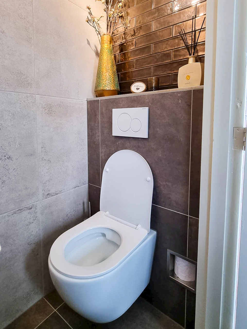 In de toiletruimte is er voor een groot deel dus van dezelfde tegels gebruikgemaakt als in de badkamer. De decortegels zorgen ervoor dat er een modern en stijlvol geheel ontstaat. Omdat de decortegels best een uitgesproken uitstraling hebben, is er gekozen voor wit sanitair. De ruimte is daarnaast voorzien van een ingebouwde toiletrolhouder, wat een praktisch en stijlvol detail is.