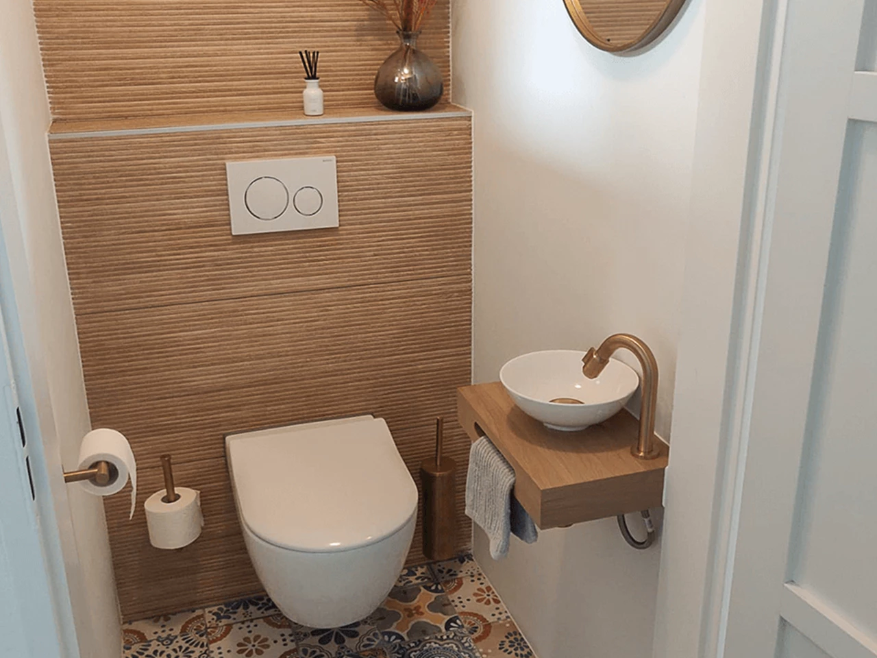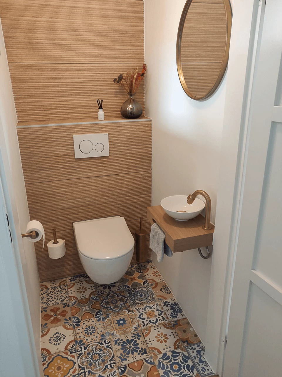 Nee, je bent niet op een andere pagina beland. Ook deze toiletruimte is namelijk samengesteld samen met de familie van der Waal. De vrolijke vloertegels zetten de kleurrijke toon in de ruimte. De achterwand van geribbelde houtlook tegels in combinatie met de witte gestucte muren, maken een mooie balans in de toiletruimte. Daarnaast past de tint van het houten planchet perfect bij de andere kleuren in de ruimte. De geborsteld-goudkleurige kraan en accessoires in combinatie met de witte elementen, maken de badkamer helemaal af. De familie heeft de toiletruimte zelf nog prachtig afgekleed met passende droogbloemen en geurstokjes.