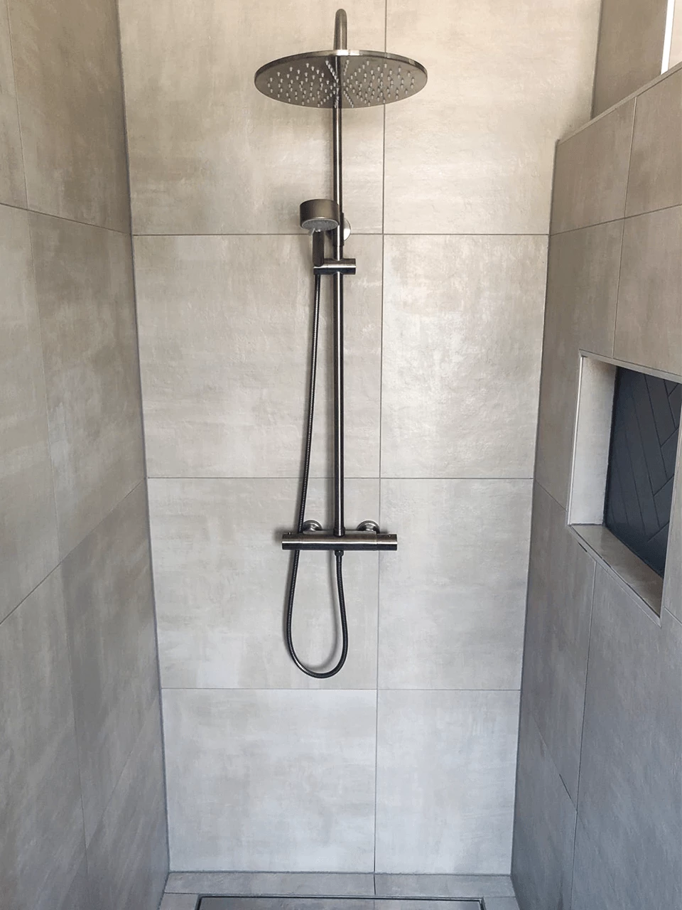 Wand- en vloertegels vormen de basis van de ruimte. Deze familie heeft dit goed begrepen en heeft gekozen voor een prachtige en sfeervolle combinatie van betonlook wand- en vloertegels én decortegels. De betonlooktegels vormen met hun formaat van 60x60 cm een mooie en rustige basis in de badkamer. Op de wand waar het badmeubel zich bevindt, zijn de decortegels Marrakech Ocean Blue in visgraatmotief geplaatst. Maar niet alleen op deze wand komen de tegels terug; ook in de nisjes boven het toilet, in de doucheruimte en boven het bad komen deze tegels terug. Dit geeft de ruimte een speels effect en creëert een mooie eenheid in de badkamer.