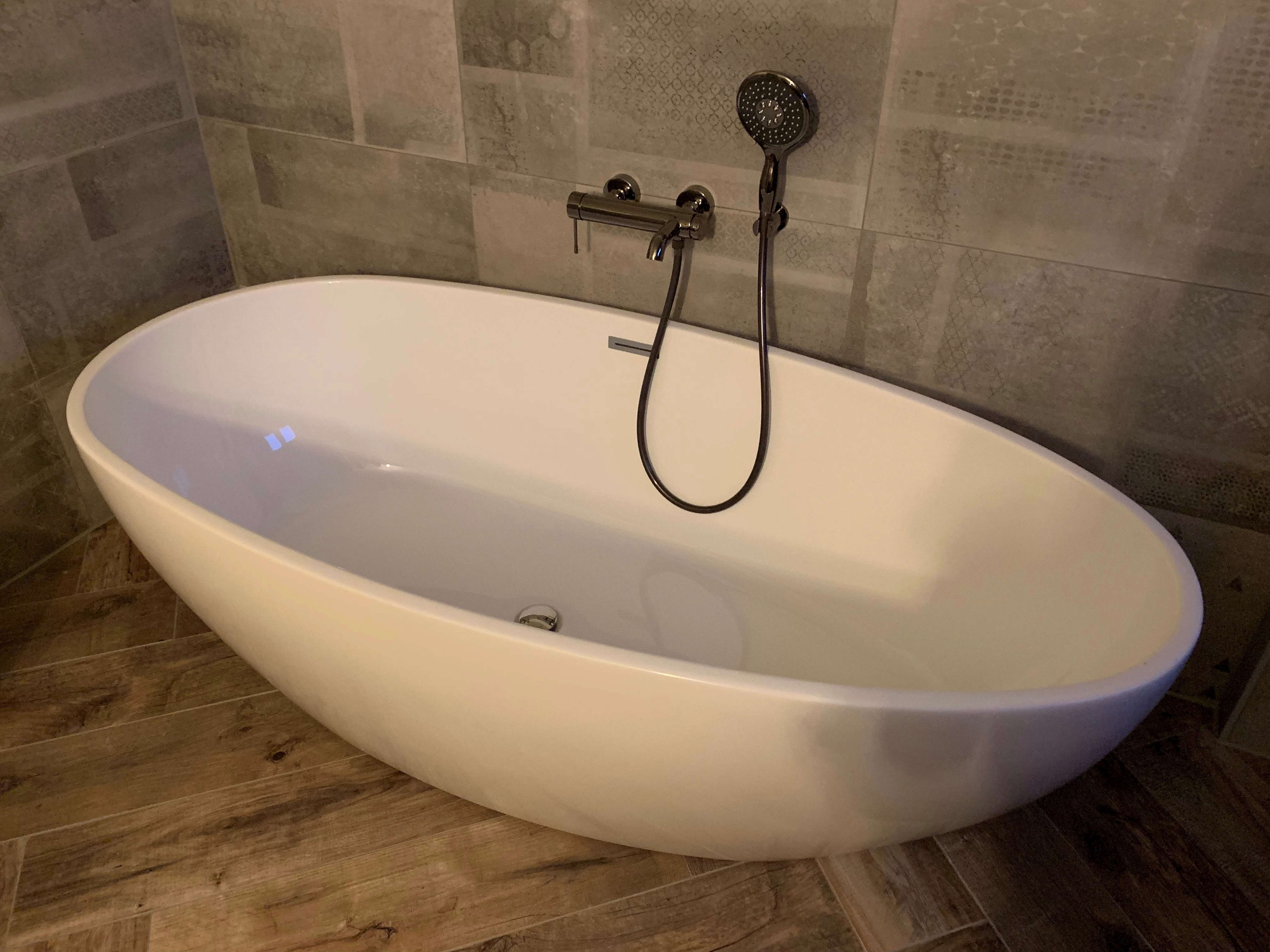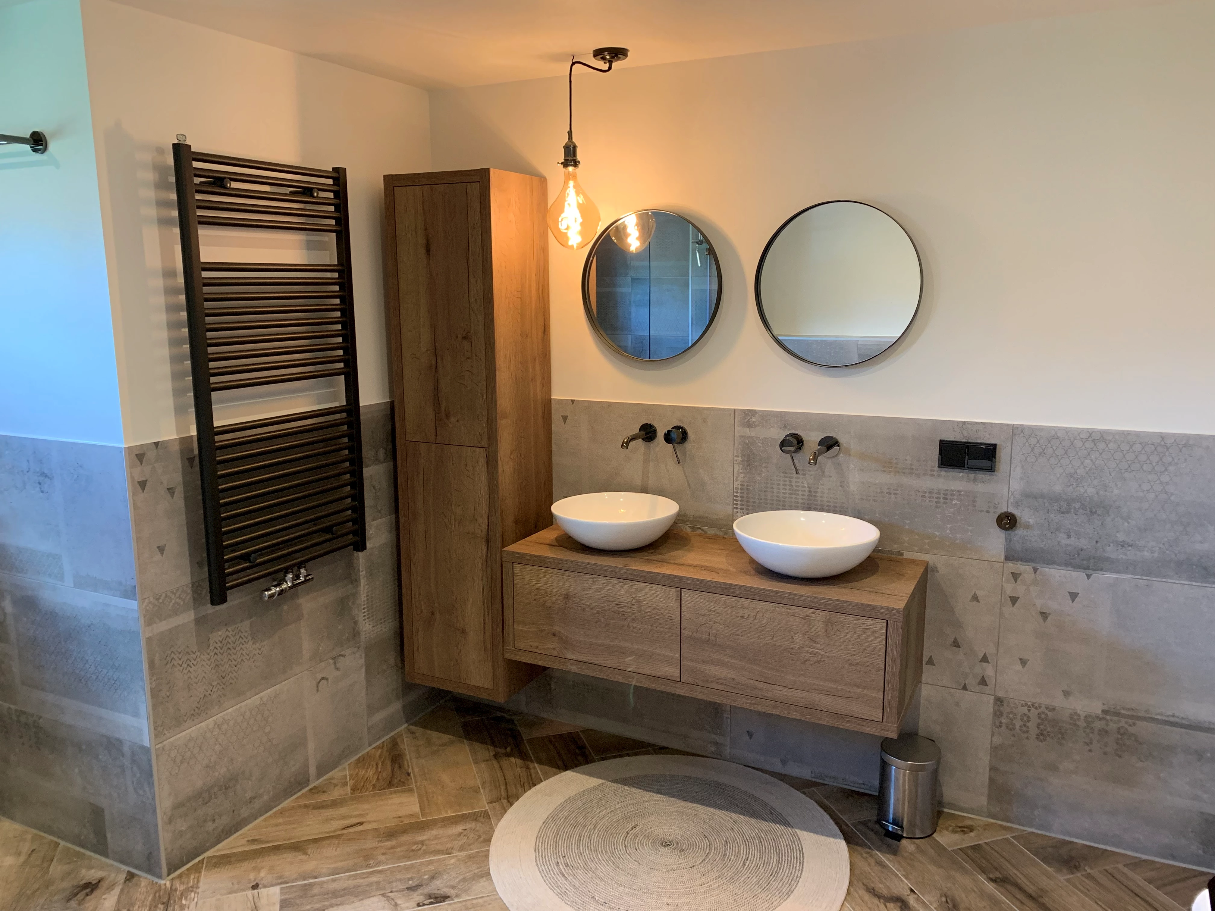 Deze badkamer is voorzien van diverse design elementen wat zorgt voor een luxe uitstraling. De wasbakken, het bad en het toilet hebben een glanzend witte kleur, waardoor deze matchen met elkaar. Verder is deze ruimte voorzien van de Infinity badkamermeubel in de Tabacco kleur. Deze past prachtig bij de houten vloer en de grijze wand.
