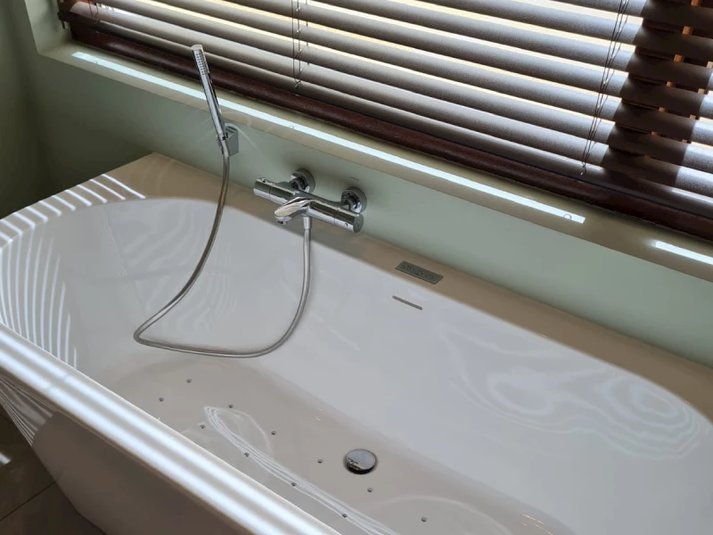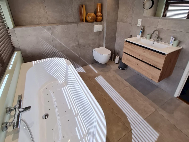 Deze prachtige badkamer is van alle luxe voorzien. Het luxe half vrijstaand bad heeft maar liefst 24 nanojets met een luchtmassagesysteem. Het badmeubel is in de kleur solid eik met 2 lades. Bovenop is een keramische wasbak met een hoge wastafelkraan in de kleur chroom gekozen. De douche is in een aparte nis geplaatst en is mooi ruim. Onder extra grote regendouche van maar liefst 31 cm doorsnede kan je perfect ontspannen. Daarnaast zorgt de Sunshower in de douche voor een extra wellness ervaring. De regendouche is in de kleur brushed graphit. De sfeer in de douche wordt mede bepaald door de luxe Mearten Ader Dark tegels.