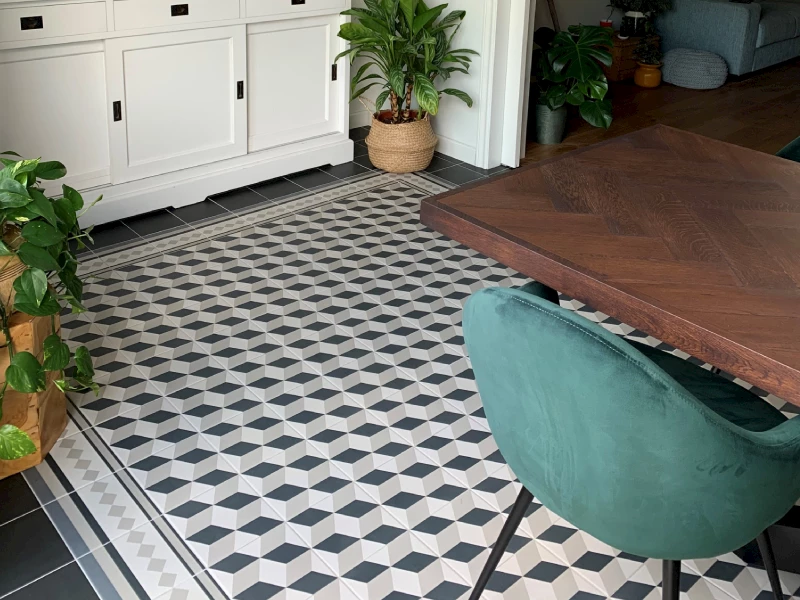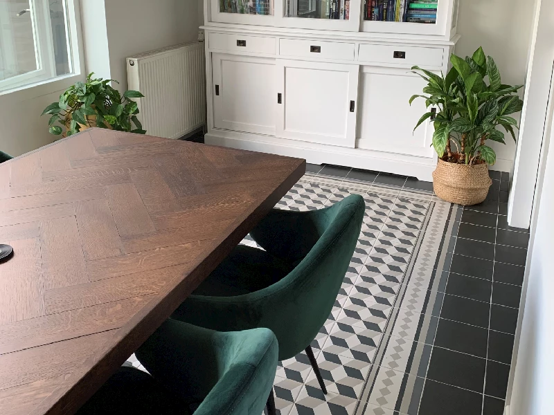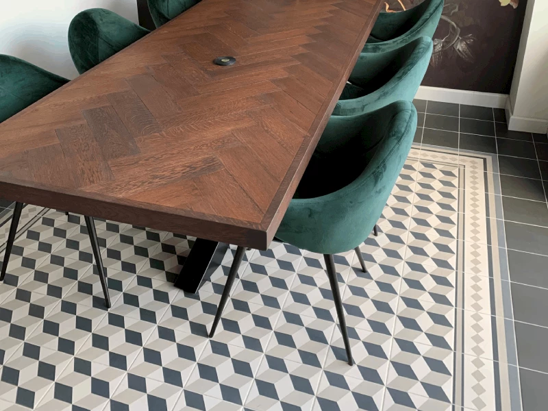 Woonvloeren zijn er in alle soorten en maten. Van strakke grote tegels tot tegels met een motief. De familie Reulink heeft een gewaagde woonvloer met een mooi patroon in hun eetruimte gelegd. De jaren 50 tegels zijn gebaseerd op het werk van de Nederlandse kunstenaar Escher. De keramische tegels met patroon zijn 20x20 cm en zijn zo gelegd zodat het lijkt op een kleed. Rondom de patroontegels liggen neutrale tegels in de kleur antraciet. Deze vloer maakt de eetkamer gelijk bijzonder en uniek!