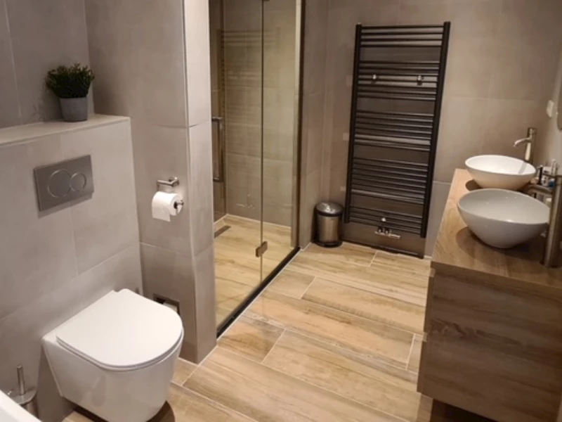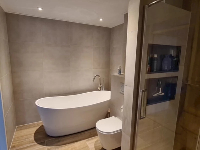 Steeds vaker kiezen mensen ervoor om de badkamer een huiselijke uitstraling te geven. Houtlook tegels zijn een van de elementen die deze sfeer kunnen creëren. Je kan houtlook tegels op zowel de wand als vloer plaatsten, waardoor je er natuurlijk ook voor kiezen om zowel de vloer als de wand ermee te bekleden. Deze tegels worden van keramiek gemaakt en zijn daardoor zeer geschikt voor badkamers. Doordat er knoesten en nerven verwerkt worden in het materiaal, lijken de tegels ook net echt en zijn ze niet te onderscheiden van laminaat, pvc of hout. In deze badkamer is gekozen voor houtlook vloertegels. Deze tegels versterken de warme en luxe uitstraling van de badkamer.