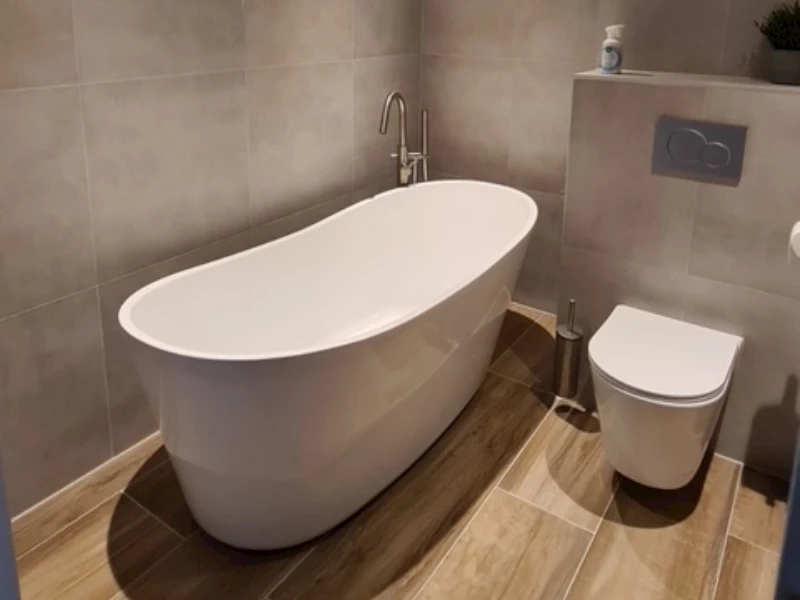 Anders dan bij inbouw- en opbouwbadkranen wordt een vrijstaande badkraan los naast het bad geplaatst. Omdat de kraan los op de grond wordt geplaatst, zijn deze kranen erg geschikt voor vrijstaande baden. Het zorgt er dan ook voor dat de badkamer een luxe uitstraling krijgt. De meeste vrijstaande badkranen zijn ook verkrijgbaar met een handdouche. Hierdoor kan je eenvoudig je haar uitspoelen, maar ook het bad schoonmaken. De familie heeft voor een vrijstaande badkraan met handdouche gekozen. Deze is schuin achter het bad geplaatst waardoor de loopruimte rondom het bad niet beperkt wordt. Je wil je natuurlijk makkelijk kunnen bewegen in de badkamer.