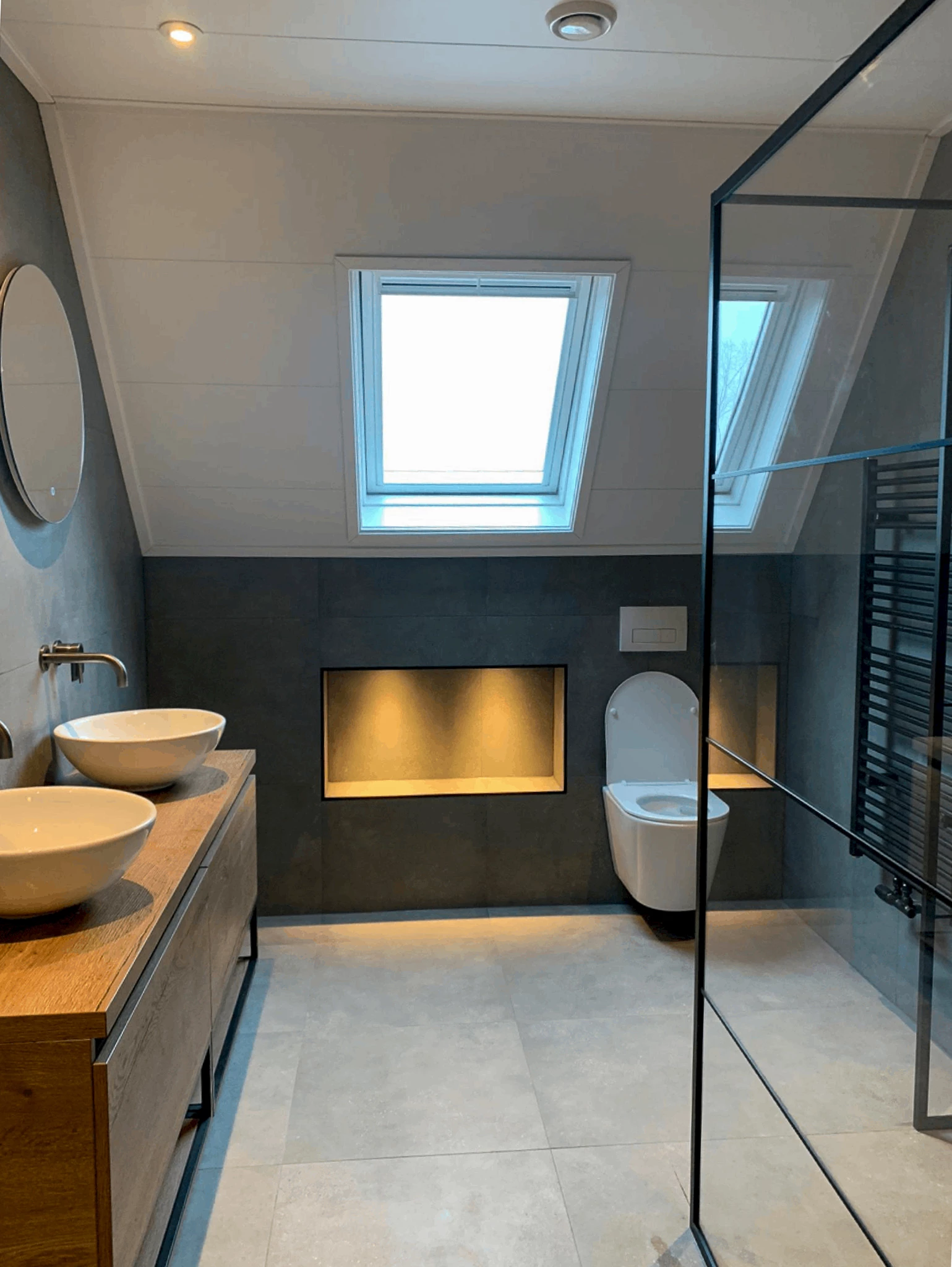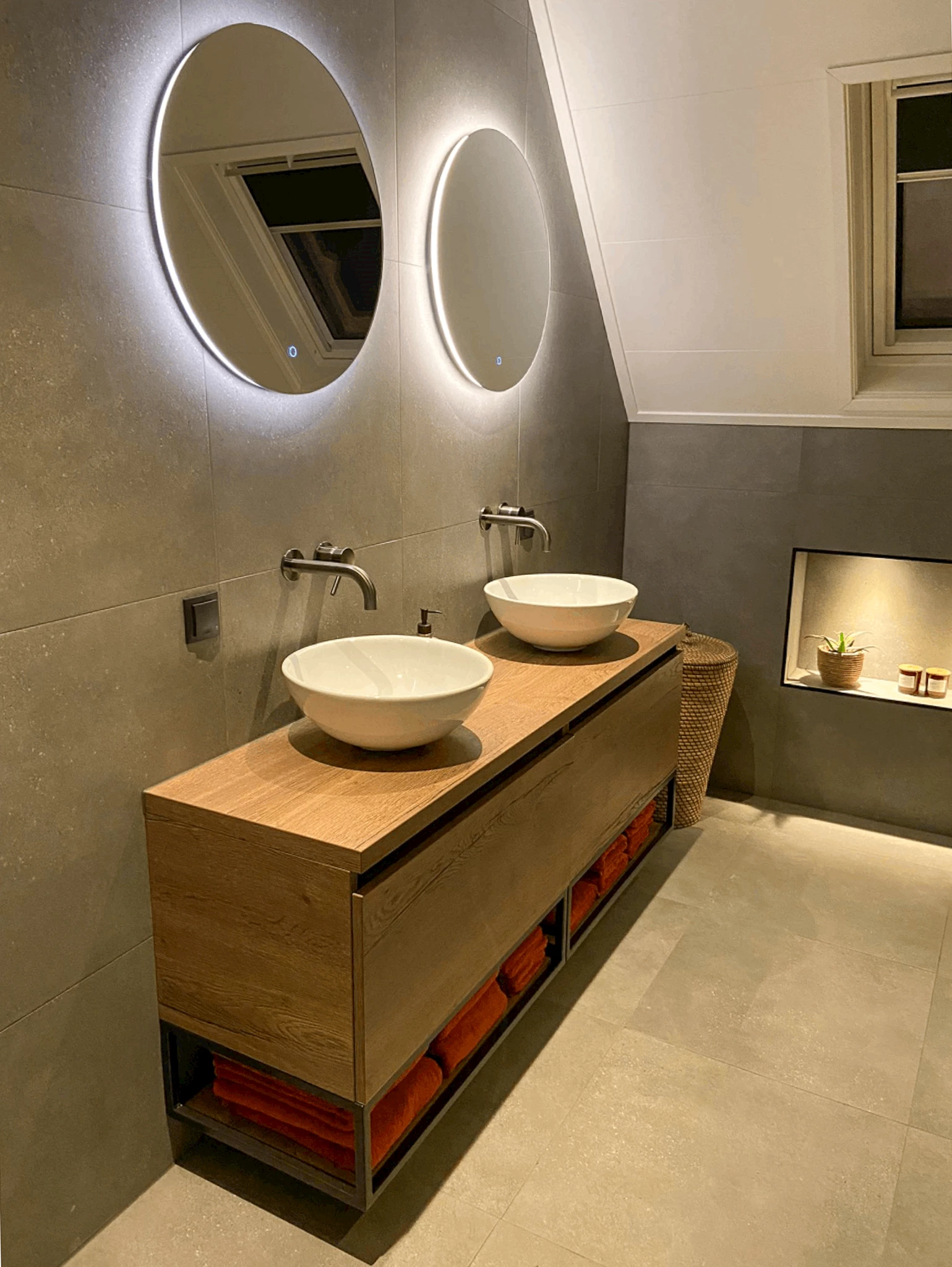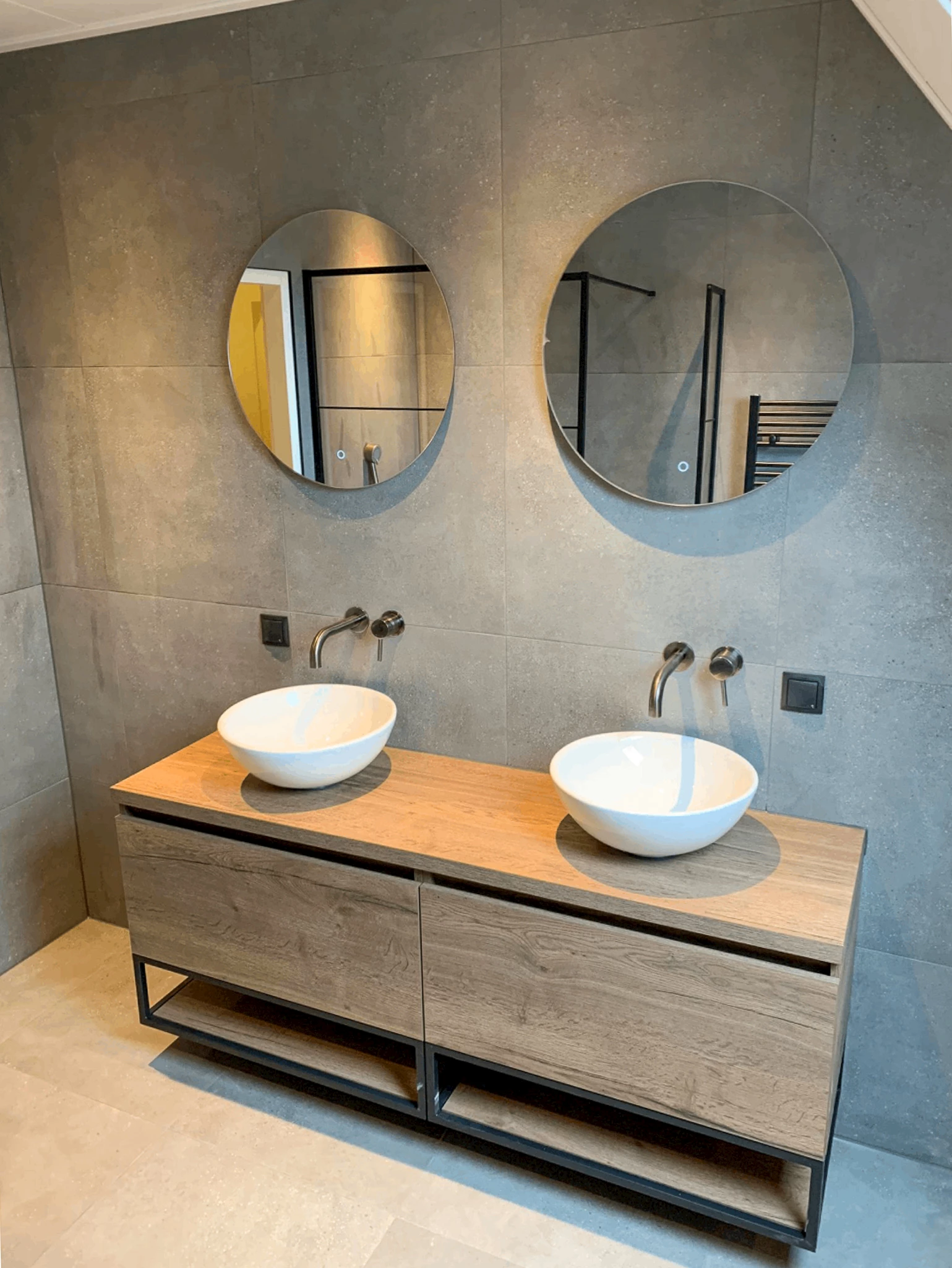 Het lijkt misschien niet zo, maar in deze badkamer is er gekozen voor één soort tegel. Door het lichtinval lijken de tegels op de wand een stuk donkerder dan de tegels op de vloer. De tegels waarvoor gekozen is hebben de kleur Steal Grey en zorgen ervoor dat de badkamer een moderne en rustige basis heeft. Een element dat opvalt in deze badkamer is het badmeubel. Dit badmeubel bestaat uit een dubbele onderkast in de kleur Tabacco, waar twee zwarte regalen aan toe zijn gevoegd. Doordat de regalen open zijn oogt de badkamer ruimtelijker. Op het badmeubel zijn twee witte waskommen geplaatst die prachtig combineren met de twee inbouwwastafelkranen in de kleur Gun Metal. De twee ronde spiegels die boven het badmeubel hangen zijn voorzien van verlichting en verwarming. De spiegelverwarming zorgt ervoor dat spiegel niet beslaat, ideaal!