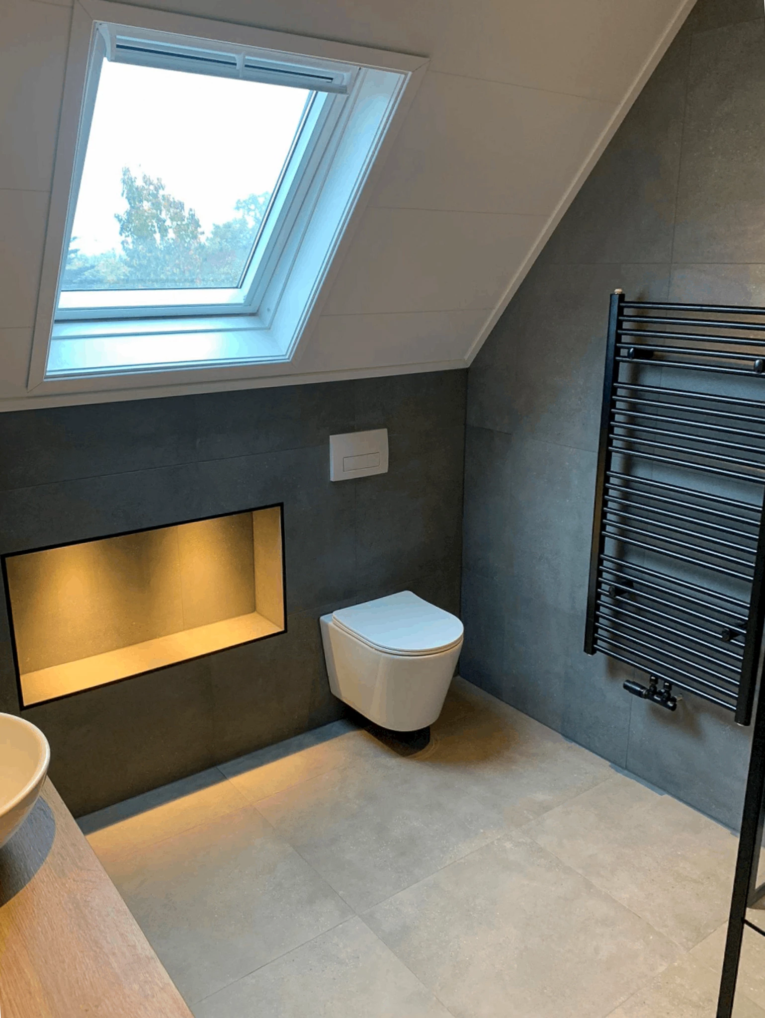 Aan alles is gedacht in deze badkamer. Het plafond van de badkamer is door het vele vocht vaak aan vervanging toe. Daarom is in deze badkamer gekozen voor een nieuw plafond van MDF, welke is voorzien van ledspotjes. De spotjes zijn niet alleen een praktische toevoeging, maar zorgen ook voor een luxe uitstraling. Daarnaast is er een toilet in de badkamer geplaatst, de set bestaat uit een bedieningspaneel en inbouwreservoir van Geberit. Het toilet is voorzien van een softclose zitting en quickrelease scharnieren, waardoor je de bril eenvoudig van de pot kunt halen. Hierdoor kun je het toilet makkelijk schoonmaken!
