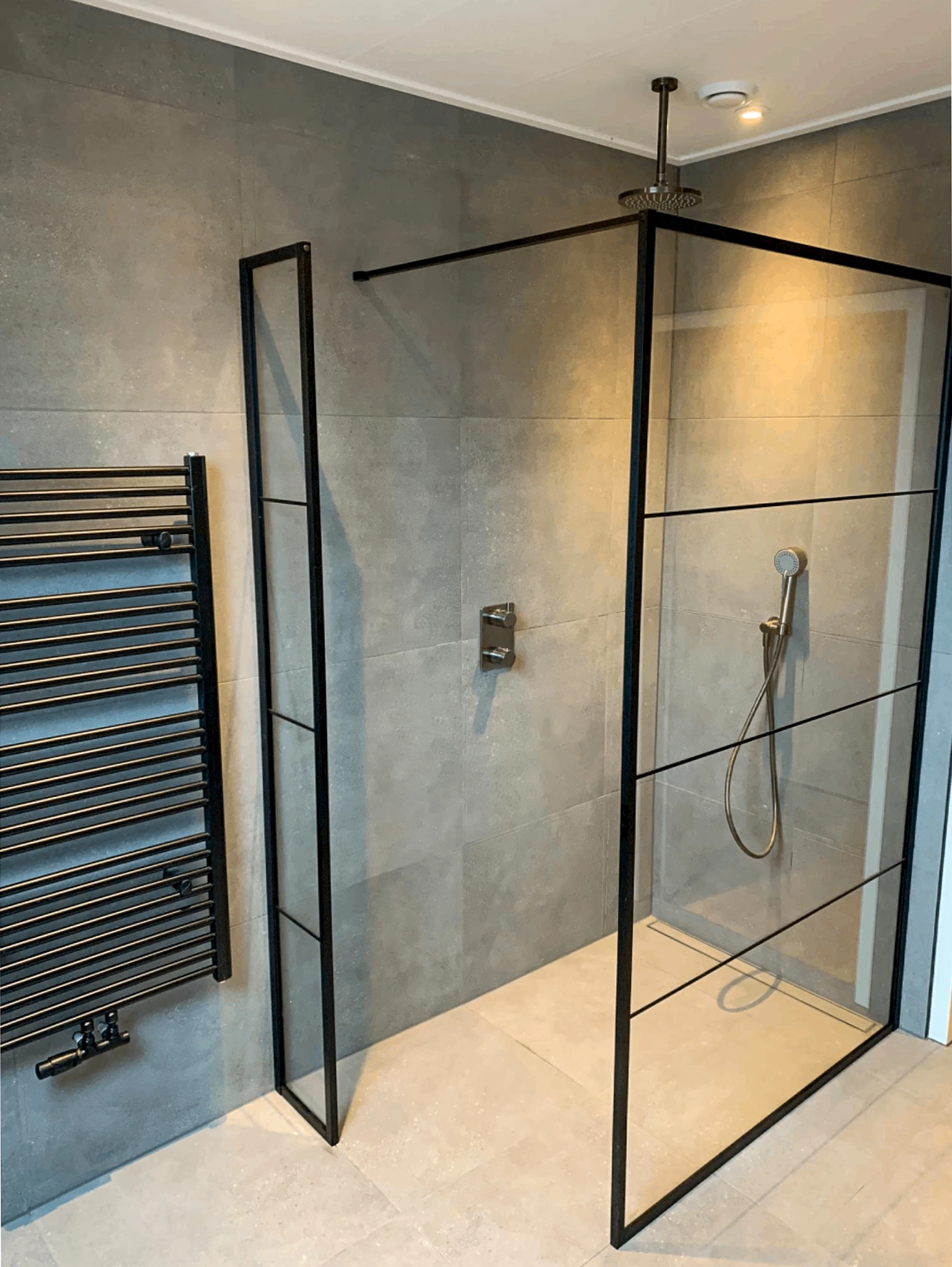 In deze badkamer is er gekozen voor een ruime inloopdouche. Het voordeel hiervan is dat je geen opstap hebt en dus zo de douche in kunt lopen. De douchecombinatie bestaat uit een regendouche en handdouche in de kleur Gun Metal, waardoor deze perfect past bij de wastafelkranen. Er is gekozen voor een glazen douchewand met een mat zwart raster. Door het plaatsen van een douchewand voorkom je dat het water de badkamer in loopt. De designradiator is achter de douche geplaatst, om ervoor te zorgen dat deze niet nat wordt is er een kleine douchewand geplaatst.
