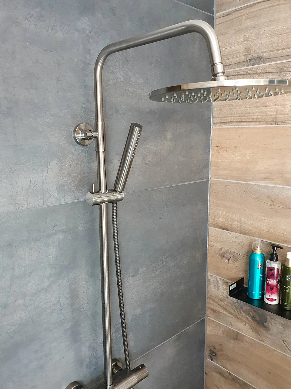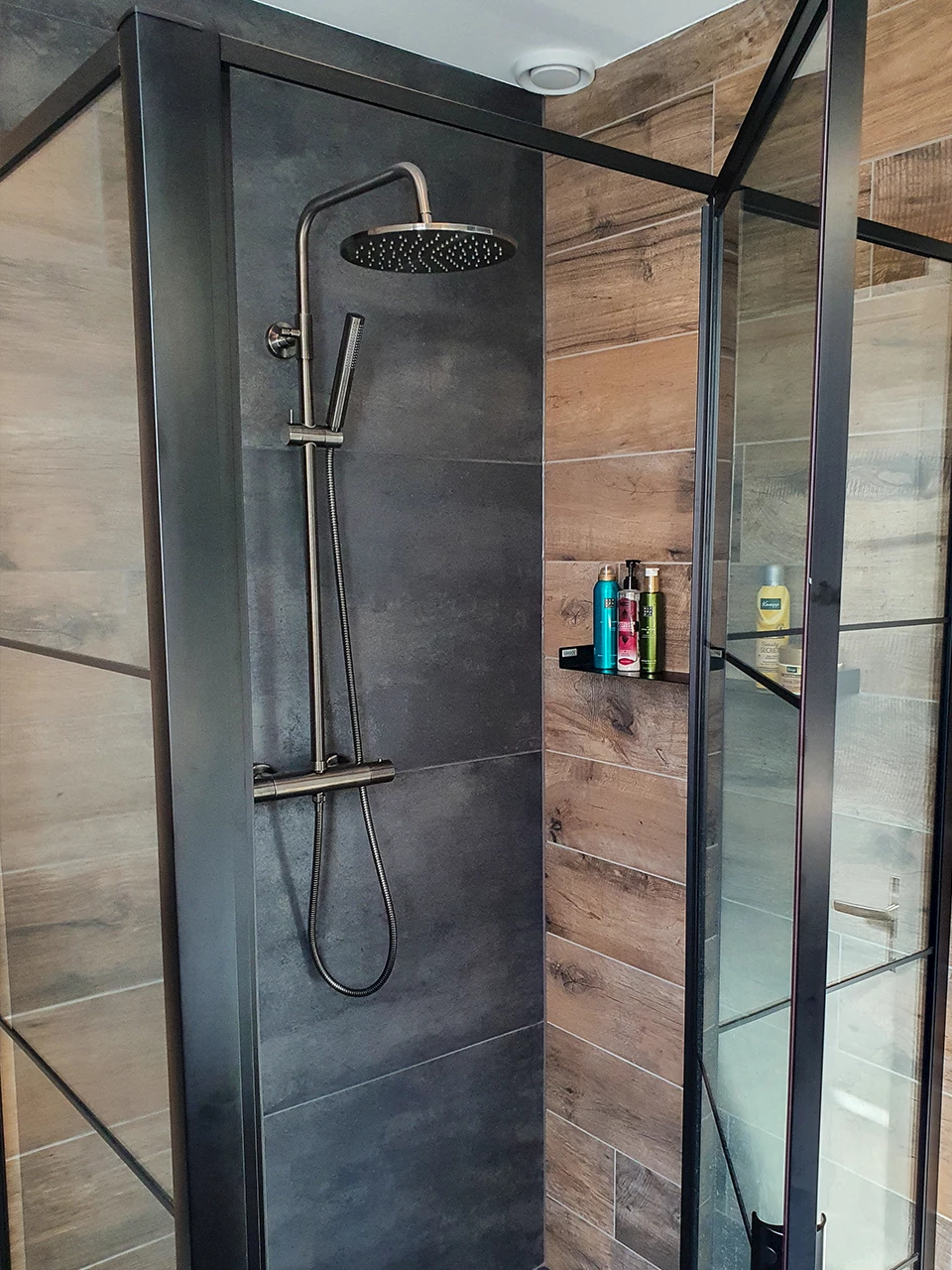 De doucheruimte bestaat uit een luxe regendouche met losse handdouche, beide hebben de kleur Gun Metal. In de doucheruimte is een wandplankje in de kleur mat zwart geplaatst. Hier kun je eenvoudig je doucheproducten op neer zetten, ideaal! Om te voorkomen dat het water de ruimte inloopt, en daarbij het toilet nat wordt, is er een douchewand geplaatst. Deze is voorzien van een mat zwart raster en versterkt daarmee de industriële uitstraling van de badkamer.