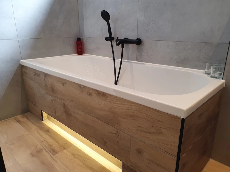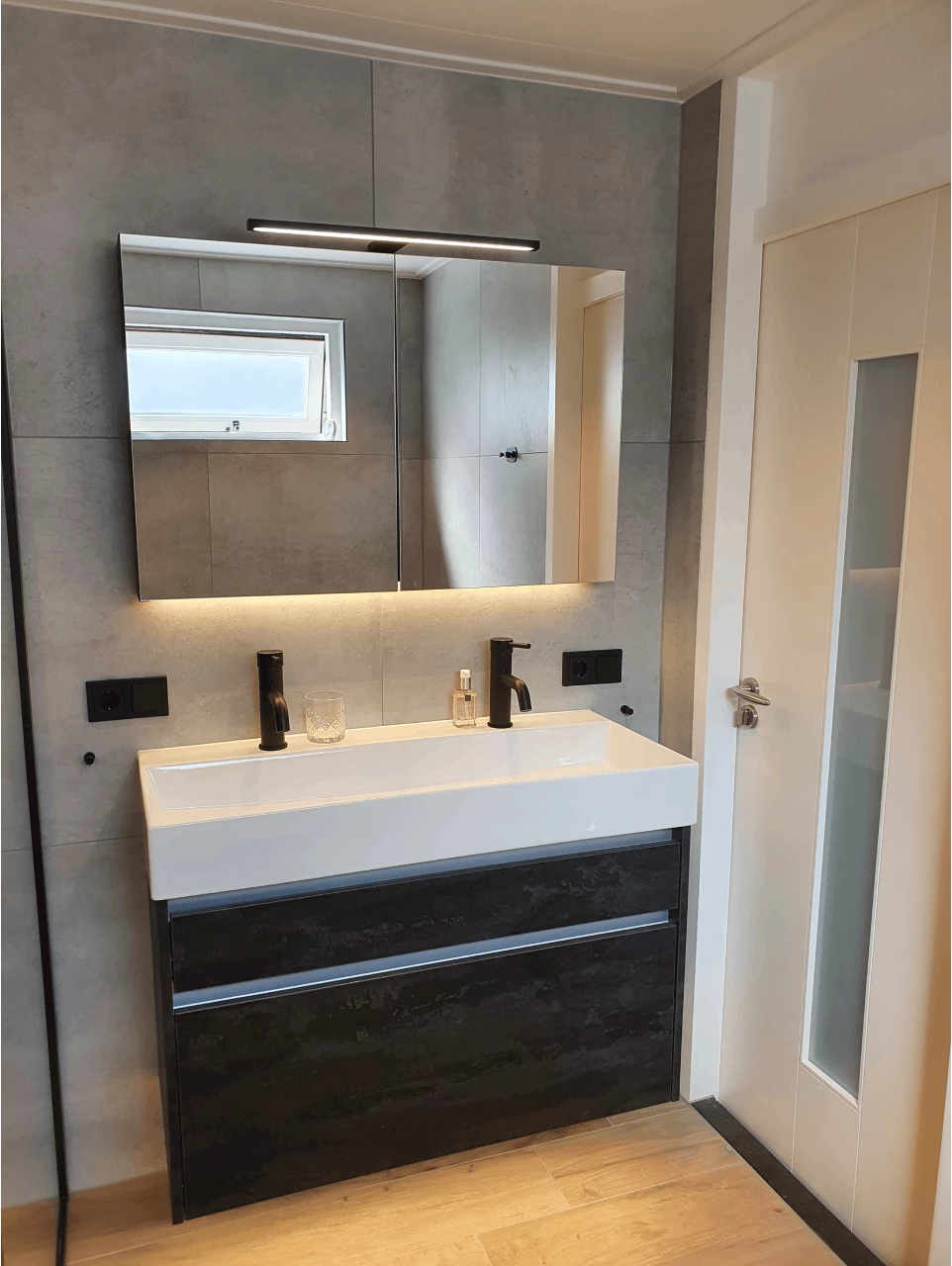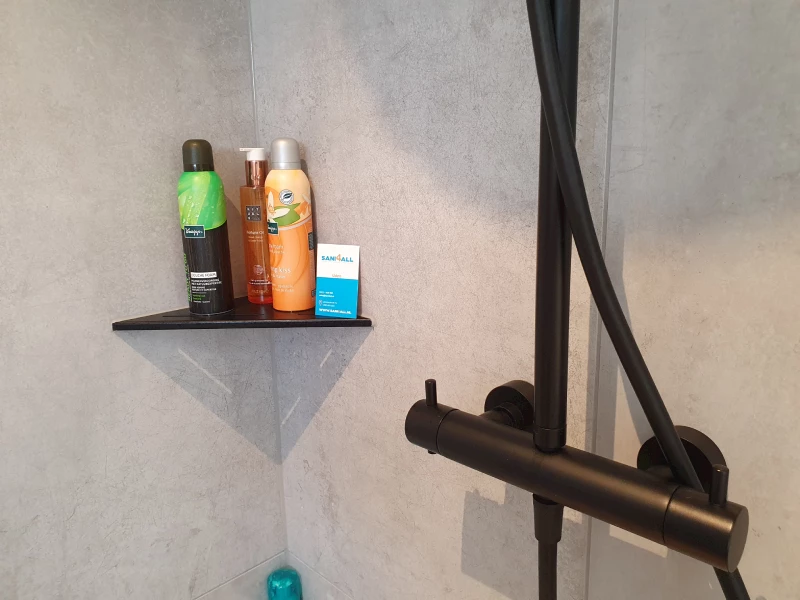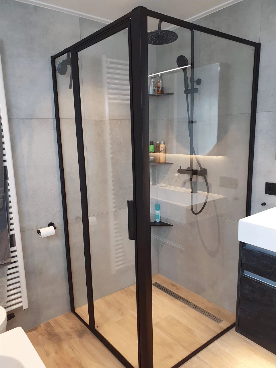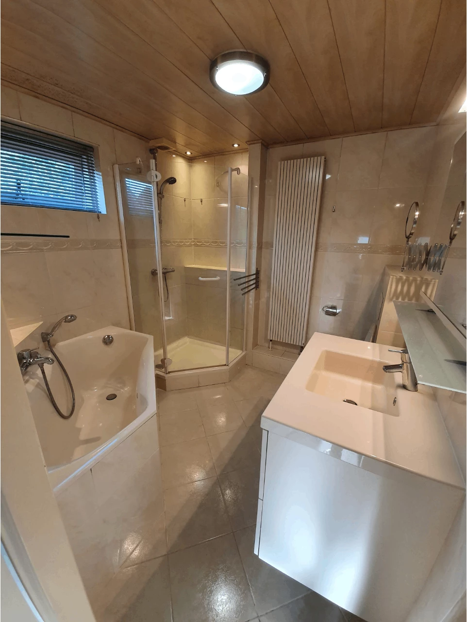 De basis van deze badkamer bestaat uit wandtegels in de kleur Platinum en vloertegels in de kleur Warm Wood. De vloertegels lijken echt hout, maar het zijn keramieken tegels met een houtlook uitstraling. Zo kan je toch kiezen voor de warme uitstraling van hout. Het Square SMART badmeubel heeft de kleur Houtskool en straalt daardoor veel luxe uit. Op het badmeubel is een witte keramische wastafel geplaatst. De wastafelkranen hebben de kleur mat zwart en passen daardoor perfect bij het badmeubel. Ook de regendouche combinatie heeft een mat zwarte kleur en bestaat uit een thermostaatkraan, een luxe regendouche en een ronde handdouche. De douchecabine heeft een mat zwart frame en is voorzien van veiligheidsglas met een NANO anti-kalk coating. Om optimaal te kunnen ontspannen heeft deze familie gekozen voor een ligbad. Het bad heeft een mat zwarte kraan met een losse handdouche. Hiermee kan je eenvoudig je haar wassen of je bad mee schoonspoelen. De toiletset van Geberit bestaat uit een wandcloset met Quickrelease scharnieren en een SoftClose zitting. De badkamer wordt verwarmd door de witte designradiator, door de ruimte tussen de buizen kan je je handdoeken ophangen of je kleding laten drogen. Zo zijn deze altijd lekker warm wanneer je onder de douche uitstapt!