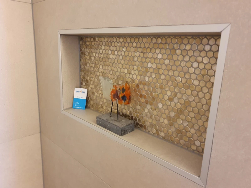 Decortegels zijn tegels met een opvallende print of hebben een bijzondere stijl, kleur of formaat. Deze tegels geven de ruimte vaak een unieke en bijzondere uitstraling en zijn daarnaast echte eyecatchers. Je kan ervoor kiezen om een volledige ruimte te bekleden met decortegels, maar dit oogt vaak wat druk. Meestal wordt ervoor gekozen om een wand of een deel van een wand te bekleden met deze tegels. In deze badkamer is het nisje in de douche bekleed met prachtige gouden decortegels. Niet alleen de gouden kleur is opvallend, ook de vorm. Deze tegels hebben namelijk een hexagon vorm, dat maakt de tegels nog unieker!