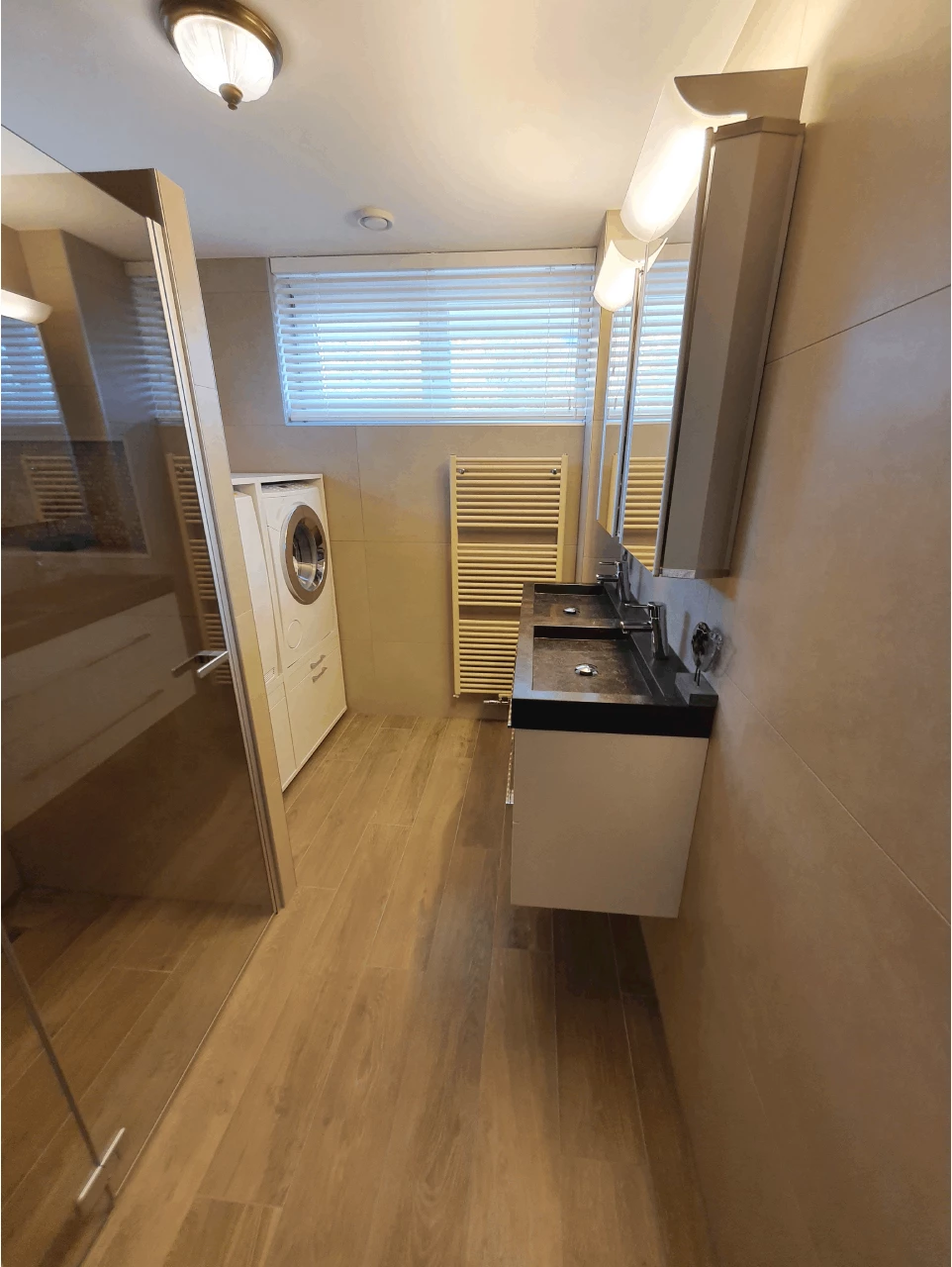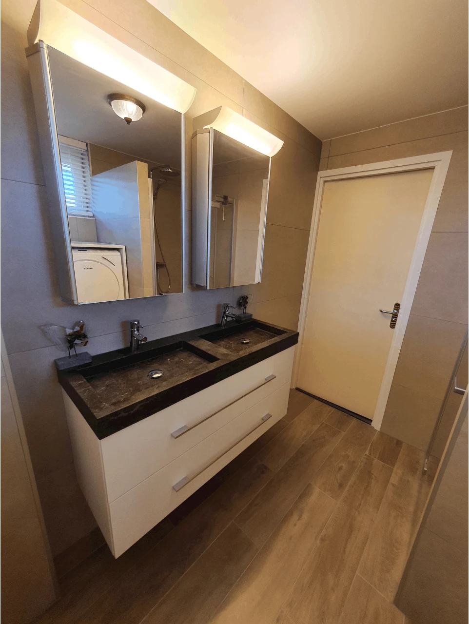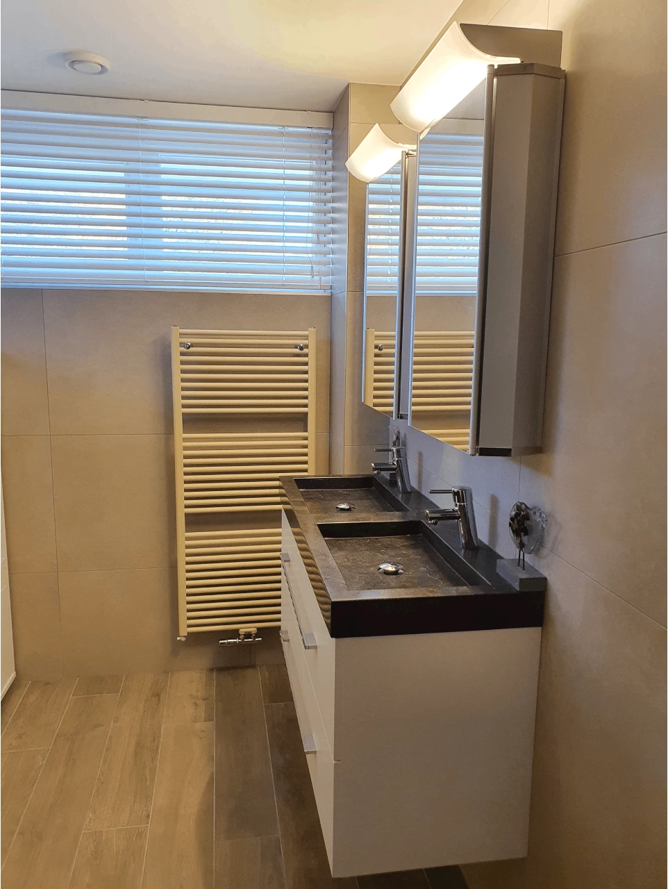 De tegelbasis van deze badkamer bestaat uit wandtegels in de kleur Warm Beige en houtlook vloertegels in de kleur Warm Wood. De nis in de douche is bekleed met de decortegel Gold, wat een unieke uitstraling creëert. Het badmeubel heeft een mat witte kleur en is voorzien van Softclose laden. De landelijke uitstraling van de houtlook tegels komt terug in de prachtige natuurstenen wastafel. Boven op de wastafel zijn twee chromen wastafelkranen van Grohe geplaatst. Ook de douchecombinatie is van chroom. Dit zorgt voor eenheid in de badkamer. Deze douchecombinatie bestaat uit een regendouche en een handdouche. De doucheset is behandeld met een anti-kalk coating waardoor je minder last hebt van kalkaanslag. Dit scheelt een hoop gedoe met schoonmaken! Daarnaast wordt de ruime inloopdouche afgesloten door een op maat gemaakte glazen douchedeur. Om de ruimte heerlijk warm te houden is er gekozen voor een designradiator. Deze heeft een beige kleur en past daardoor prachtig bij de beige tegels.
