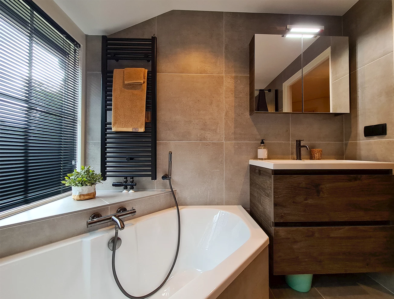 Een ander element dat een warme uitstraling heeft, is de badmeubelset. Deze bestaat uit een onderkast in de kleur Espresso, een witte keramische wastafel en een ruime spiegelkast. Om het badmeubel af te maken is er gekozen voor een Gun Metal wastafelkraan. Tegenover het badmeubel is de doucheruimte geplaatst. De familie heeft gekozen voor een vijfhoekige douchecabine in de kleur mat zwart en een regendoucheset in de kleur Gun Metal.