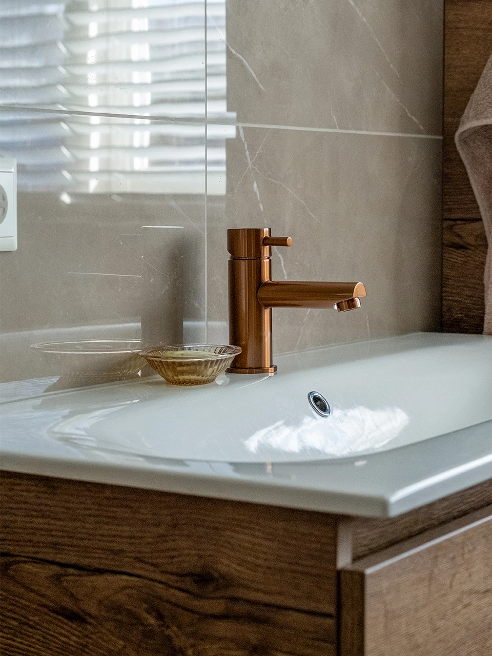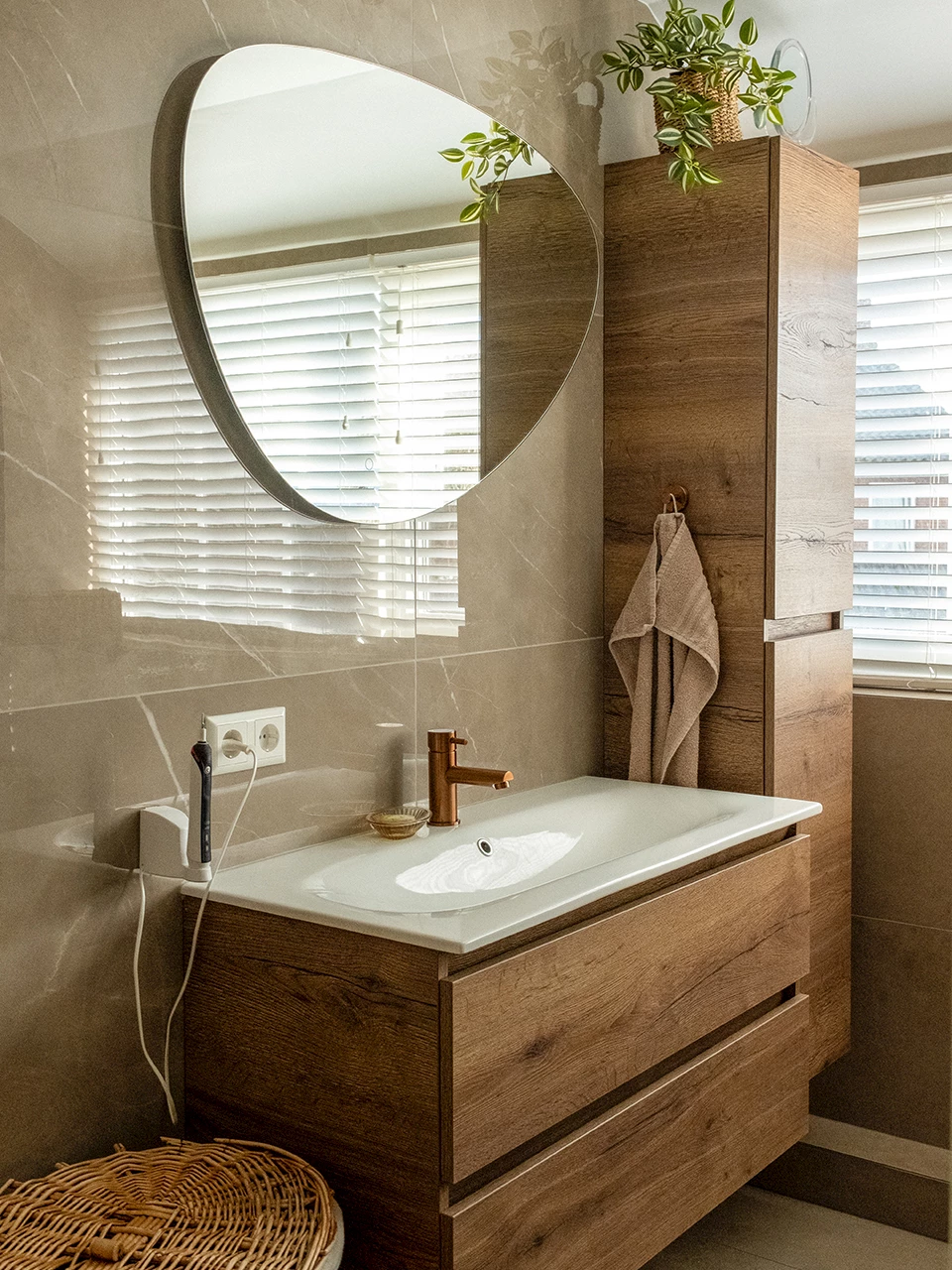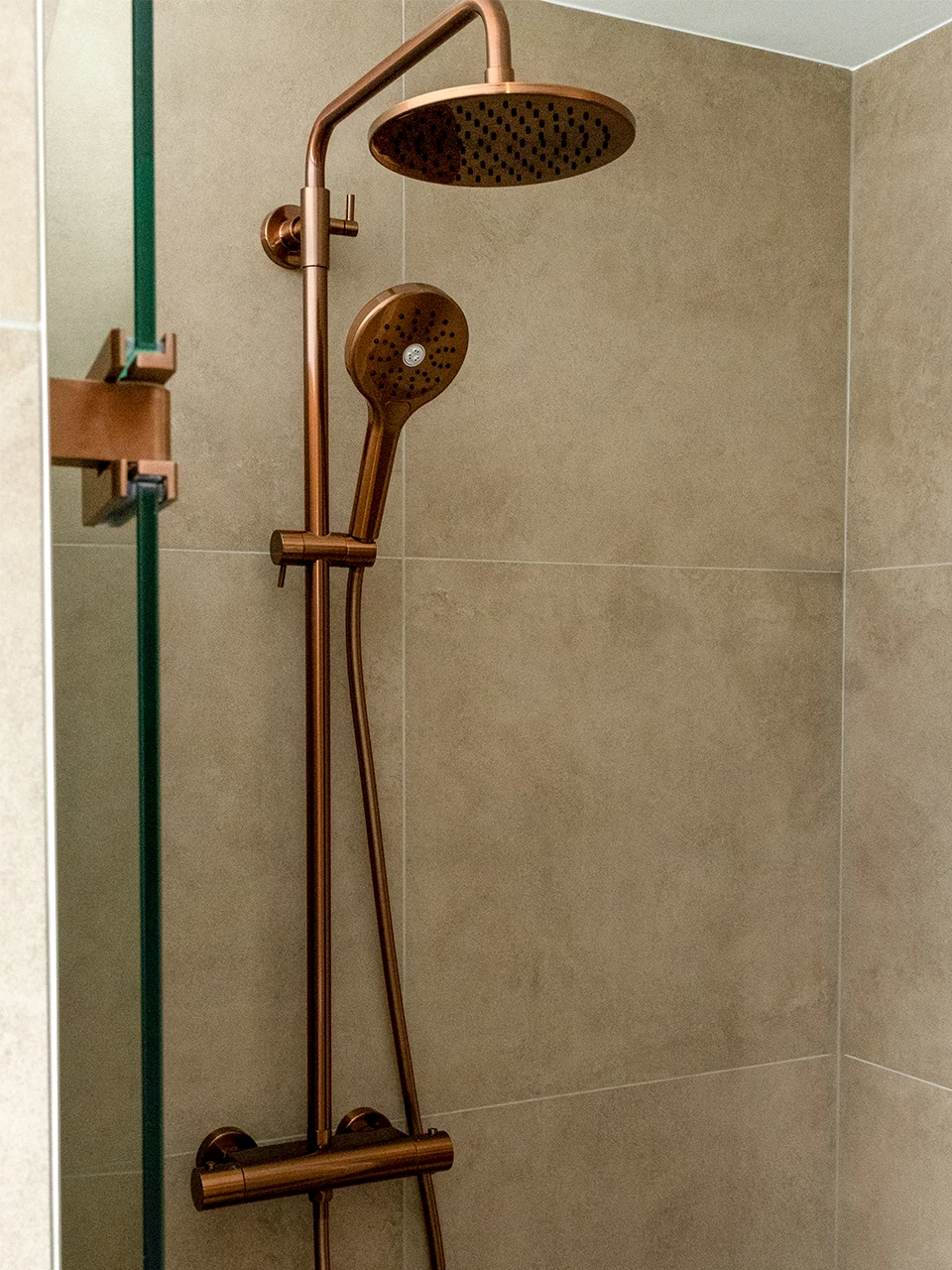 De warme sfeer van de badkamer wordt versterkt door de badmeubelset. Deze bestaat uit een onderkast en een kolomkast in de kleur Tabacco. Op de onderkast zijn een witte keramische wastafel en een koperkleurige wastafelkraan geplaatst. Boven de set hangt een prachtige organische spiegel voorzien van verlichting en verwarming. Ook in de doucheruimte is er voor koperkleurige elementen gekozen. In de ruimte is een koperkleurige regendoucheset geplaatst en ook de douchedeur bevat koperkleurige accenten.