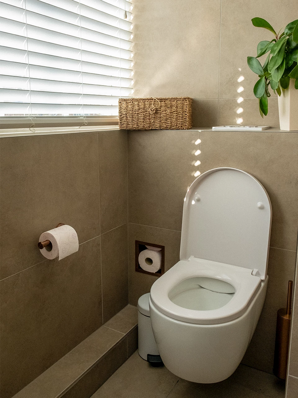 Door de samenstelling van deze badkamer, heeft de familie zowel voor praktisch als comfort gekozen. Zo is er in de hoek van de badkamer een toilet geplaatst, wat fijn kan zijn wanneer je graag een tweede toilet wil creëren. Daarnaast is de doucheruimte voorzien van een zitje, waar je heerlijk op kunt plaatsnemen tijdens het douchen. Zo zie je maar dat functioneel ook stijlvol kan zijn!