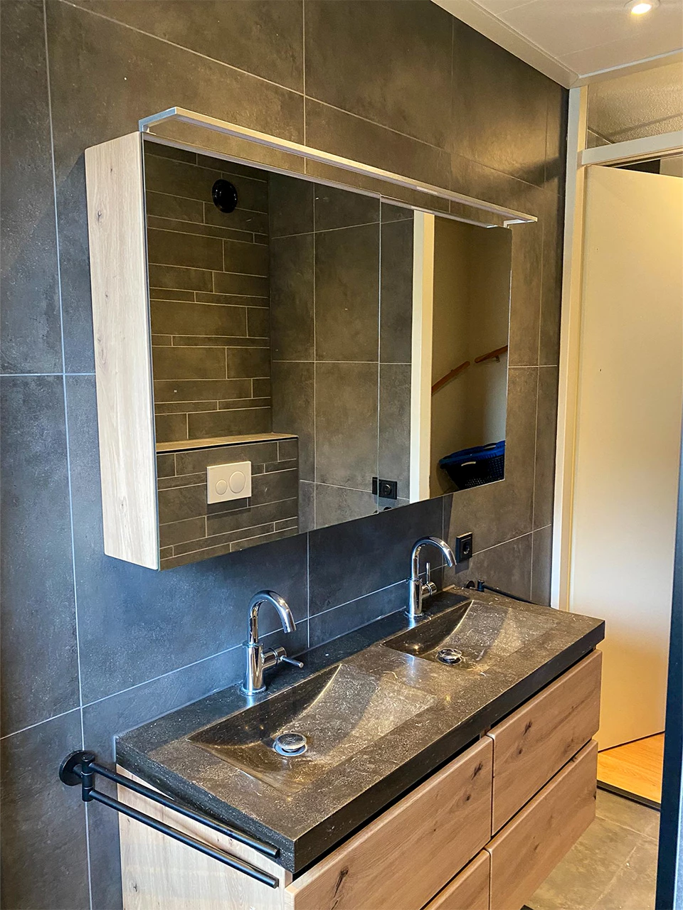In deze badkamer is er gekozen voor dezelfde tegels in verschillende afmetingen. Op de vloer en wanden zijn 60x60 cm tegels geplaatst in de kleur antraciet grijs, deze zijn gecombineerd met decortegels in dezelfde kleur. De decortegels zijn in een wildverband gelegd, wat voor een speelse touch zorgt. De badmeubel combinatie zorgt voor de warme uitstraling van de ruimte. Deze bestaat uit een houtlook onderkast met de kleur Sollid Oak welke gecombineerd is met een natuurstenen wastafel en chromen wastafelkranen. De familie heeft ook gekozen voor een hoge kolomkast, deze heeft dezelfde kleur als het badmeubel waardoor de warme uitstraling versterkt wordt.