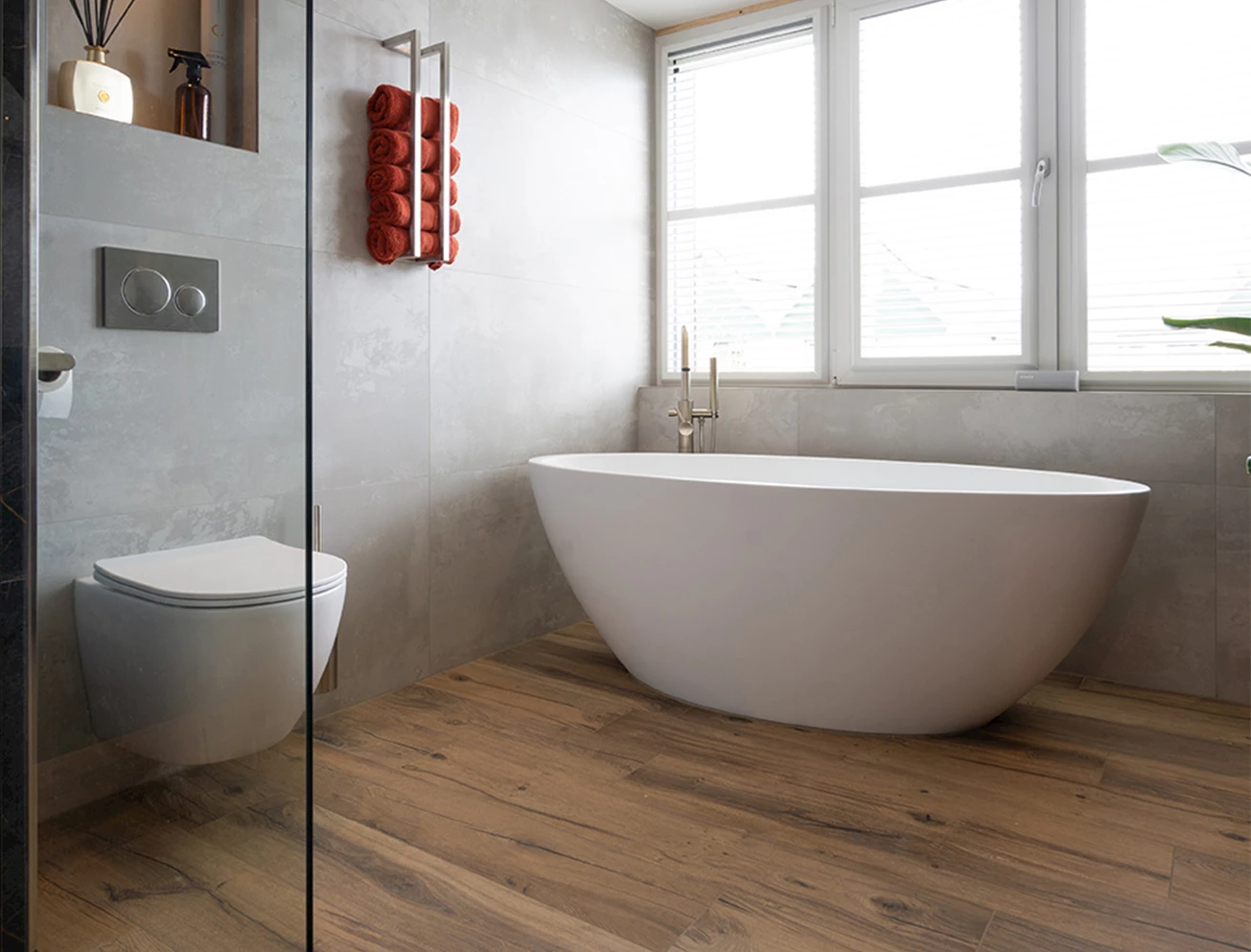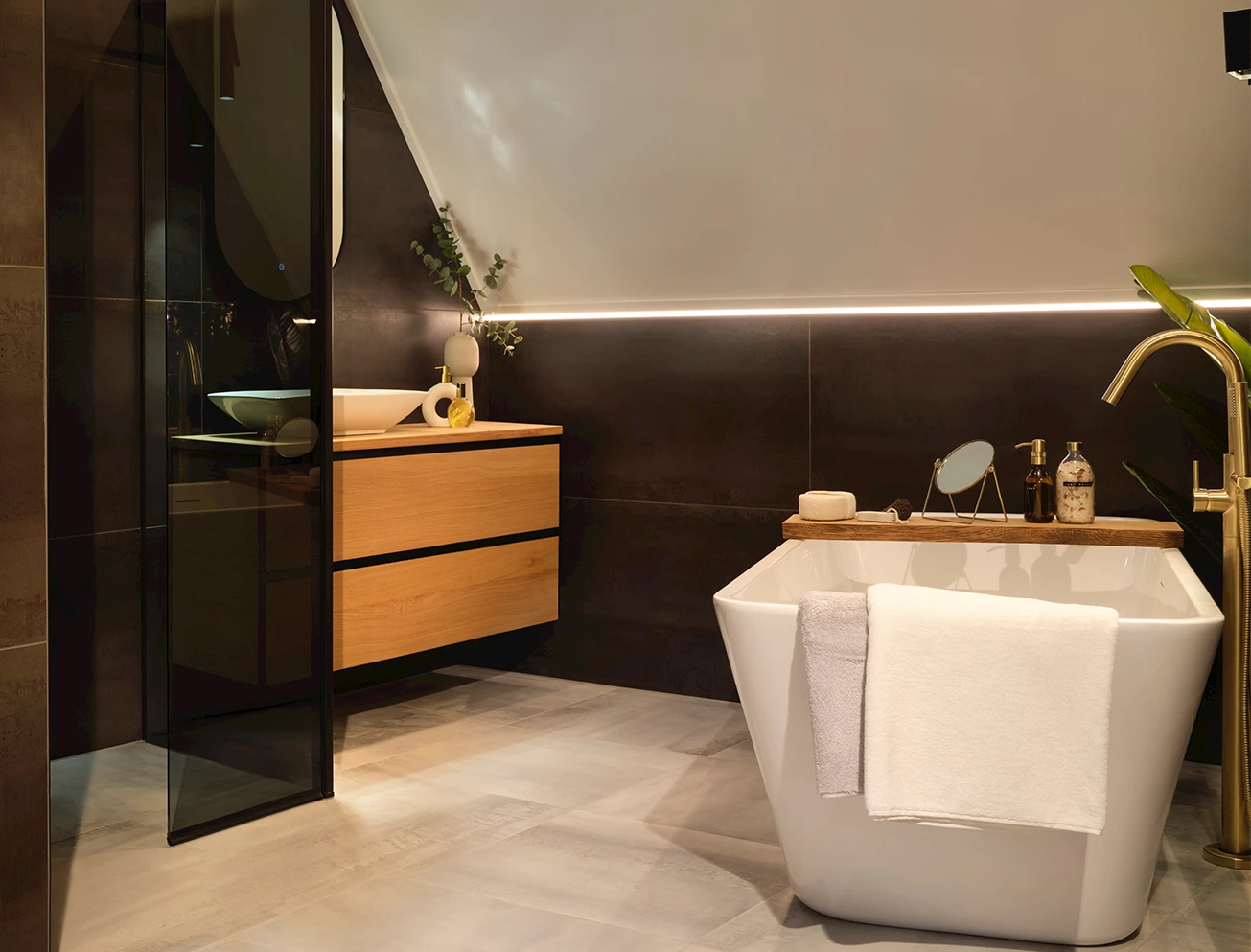 Bij een ensuite badkamer kun je eigenlijk voor vrijwel ieder bad kiezen. We zien vaak de keuze voor een vrijstaand bad, maar hou er dan wel rekening mee dat dit relatief veel ruimte inneemt. Wanneer de ruimte wat kleiner is, kun je ook kiezen voor een inbouwbad of een semi-vrijstaand bad.