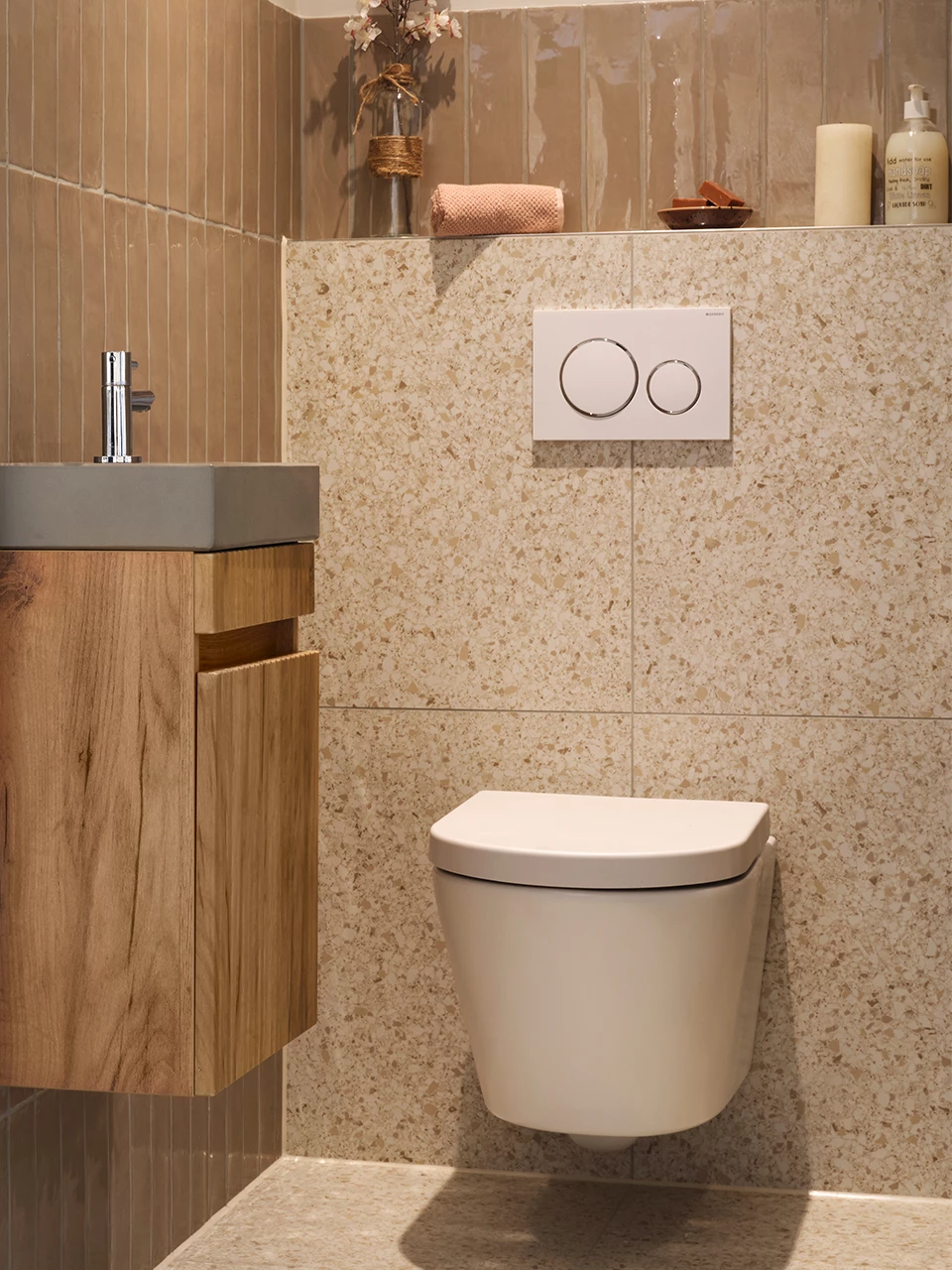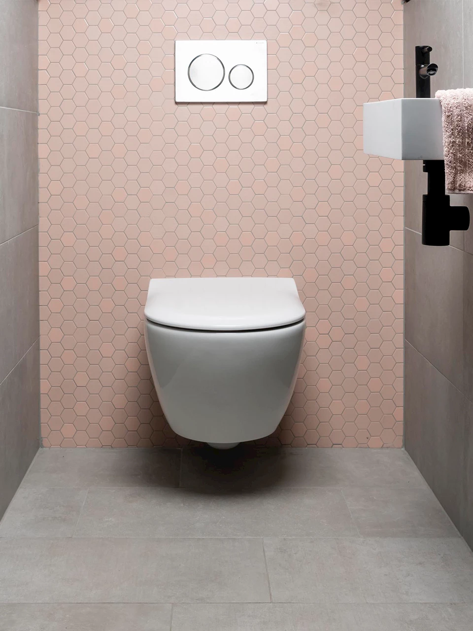 Roze is waarschijnlijk niet de eerste kleur waar je aan denkt voor je nieuwe toiletruimte. Toch kun je hier hele mooie en stijlvolle combinaties mee maken. Ga bijvoorbeeld voor roze metrotegels en een terrazzovloer of kies voor een combinatie met betonlook.
